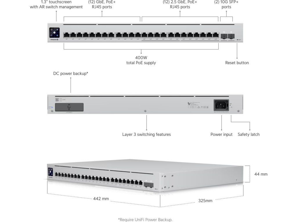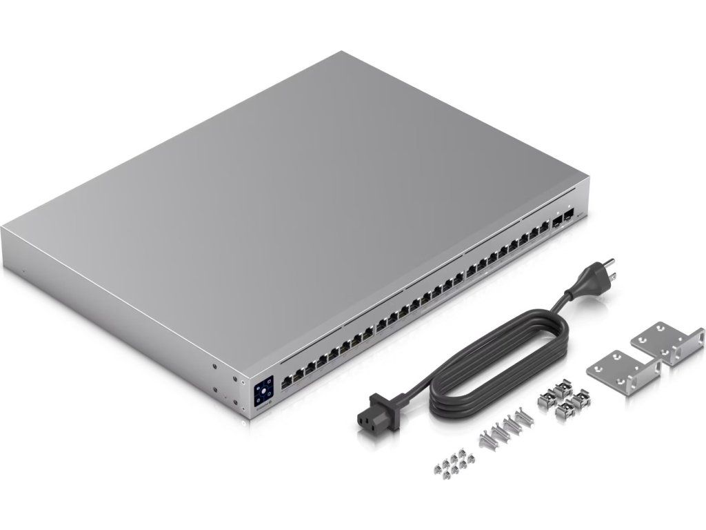 UniFi Switch Enterprise 24 PoE je spoľahlivý, spravovateľný 2.5-gigabitový prepínač L3 s prepínacou kapacitou 124 Gb/s, (12) 2.5-gigabitové porty LAN, ďalších (12) gigabitových portov LAN a dva porty SFP+ (10 Gb/s). Všetky ethernetové porty podporujú štandard 802.3af/at PoE-Out s výstupným výkonom 30 W/port a celkovým rozpočtom PoE 400 W. Okrem štandardných funkcií má prepínač aj 1,3" dotykový displej, ktorý poskytuje informácie o systéme, teplote, štatistikách portov, napájaní PoE a mnoho ďalších informácií. Prepínač je možné napájať štandardným 230V napájaním, ale aj prostredníctvom UniFi SmartPower RPS, ktoré slúži skôr na zálohovanie napájania v prípade výpadku interného zdroja.