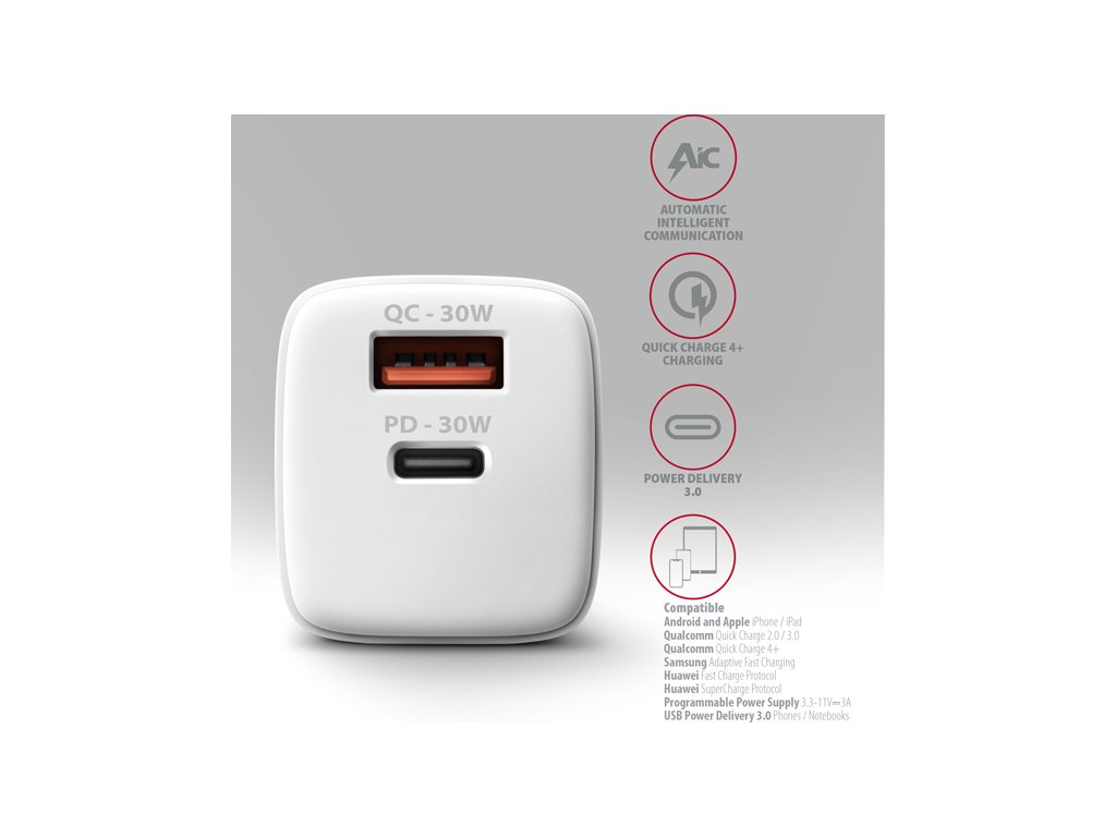 AXAGON ACU-PQ30W, Sil nabíjačka do siete 30W, 2x port (USB-A + USB-C), PD3.0/PPS/QC4+/SFC/AFC/Apple, biela