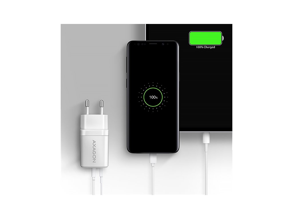 Kompaktná sieťová nabíjačka AXAGON ACU-PQ30W Sil USB pre rýchle nabíjanie až dvoch mobilných zariadení súčasne. Nabíjačka s celkovým výkonom 30 W nabíja telefóny, tablety a ďalšie mobilné zariadenia najvyššou možnou rýchlosťou. Adaptér ponúka nielen štandardný USB-A konektor, ale aj obojstranný USB-C konektor.