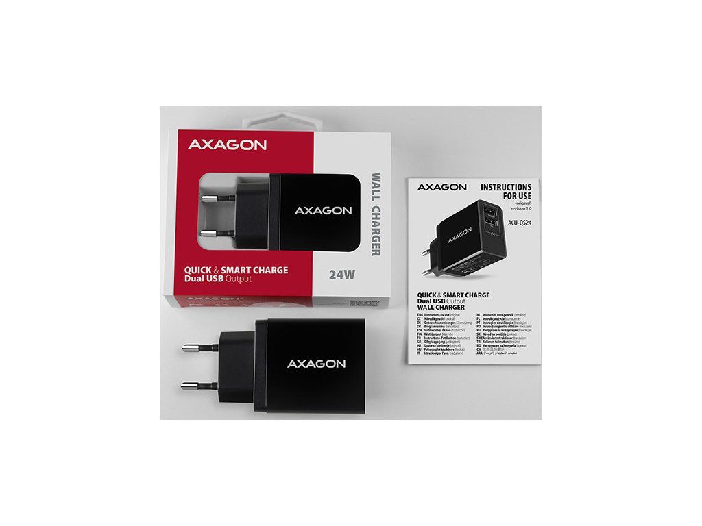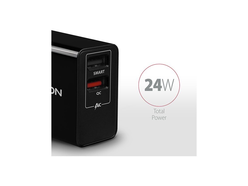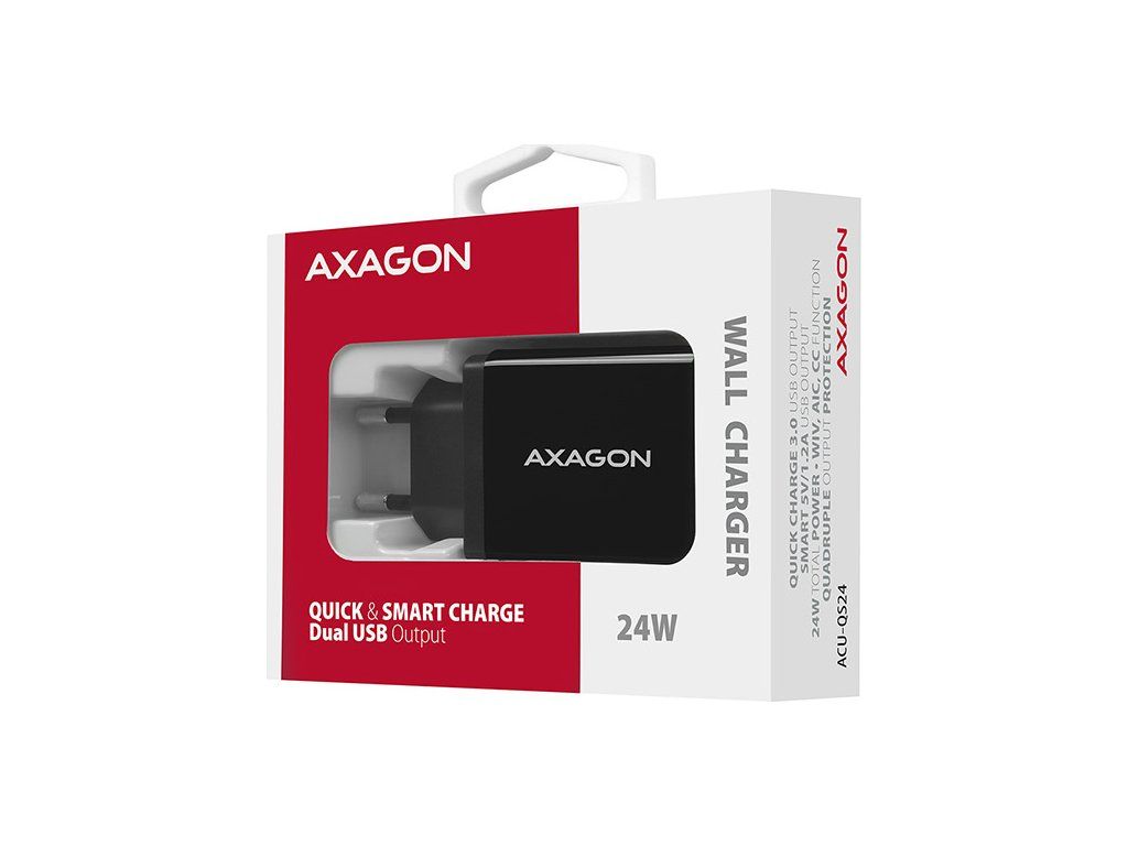 AXAGON ACU-QS24, sieťová nabíjačka QC & SMART 24 W, 2x port USB-A, QC3.0/AFC/FCP + 5V/1,2A