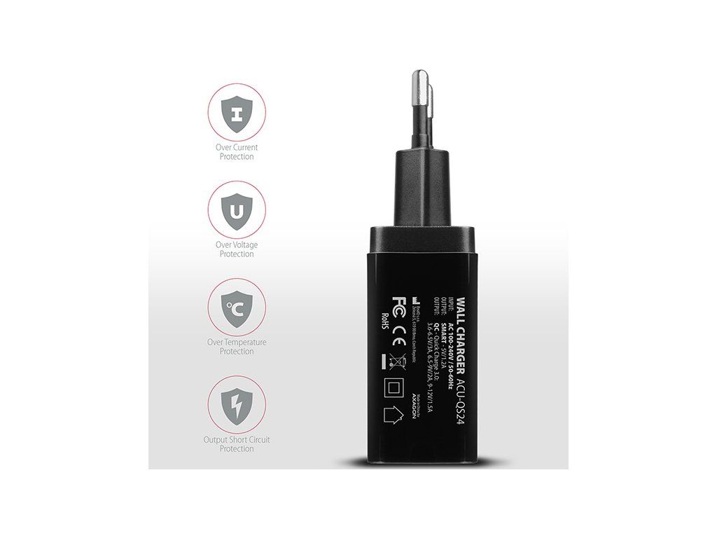 Dva nezávislé výstupy USB Quick Charge 3.0 a SMART 5V/1.2A umožňuje rýchle nabíjanie väčšiny mobilných zariadení. Je kompatibilný so zariadeniami Apple iPhone, iPad, Samsung, Huawei, Honor, HTC, Xiaomi, LG, Motorola a ďalšími štandardmi rýchleho nabíjania.