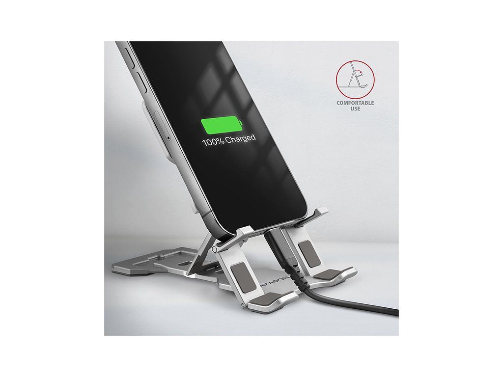 Podstavec je vyrobený z kvalitného a pevného hliníka a má protišmykový povrch, ktorý zabraňuje nechcenému pohybu. Chráni tiež povrch zariadenia a povrch pod stojanom. Tieto funkcie zaručujú dokonalú stabilitu vášho smartfónu alebo tabletu.