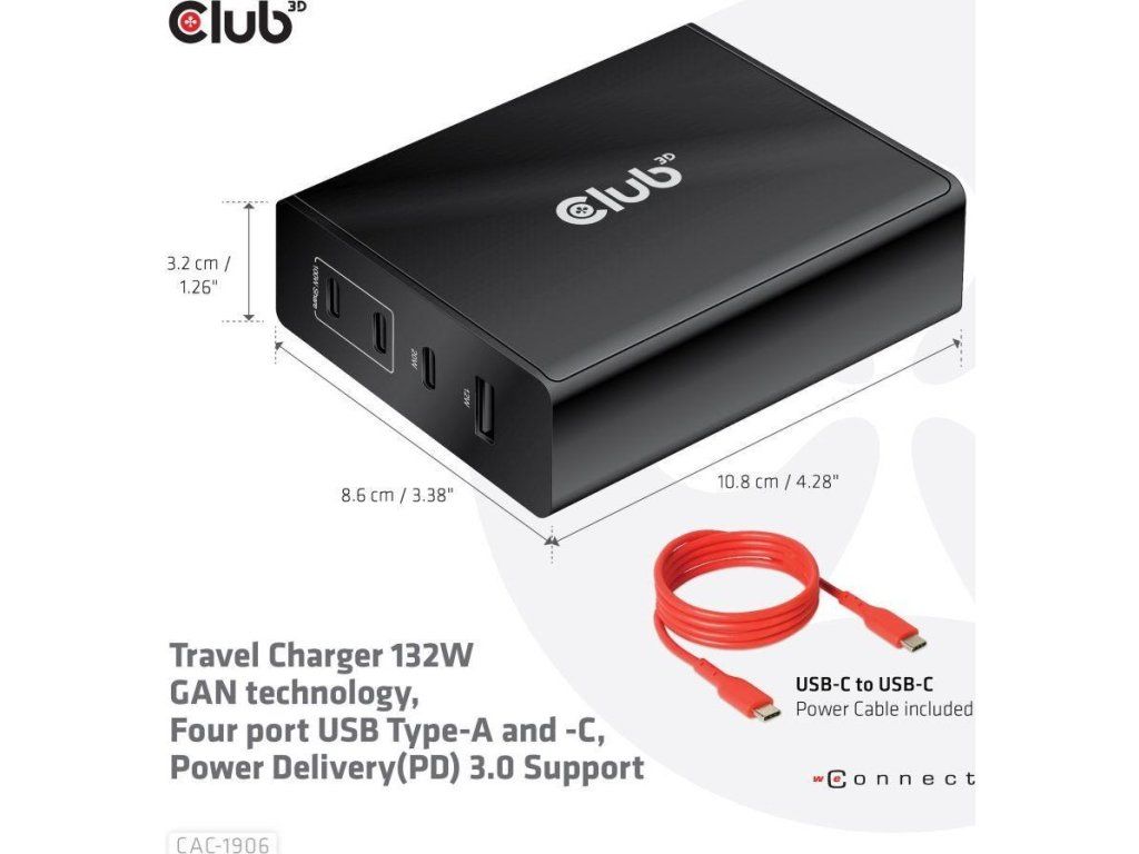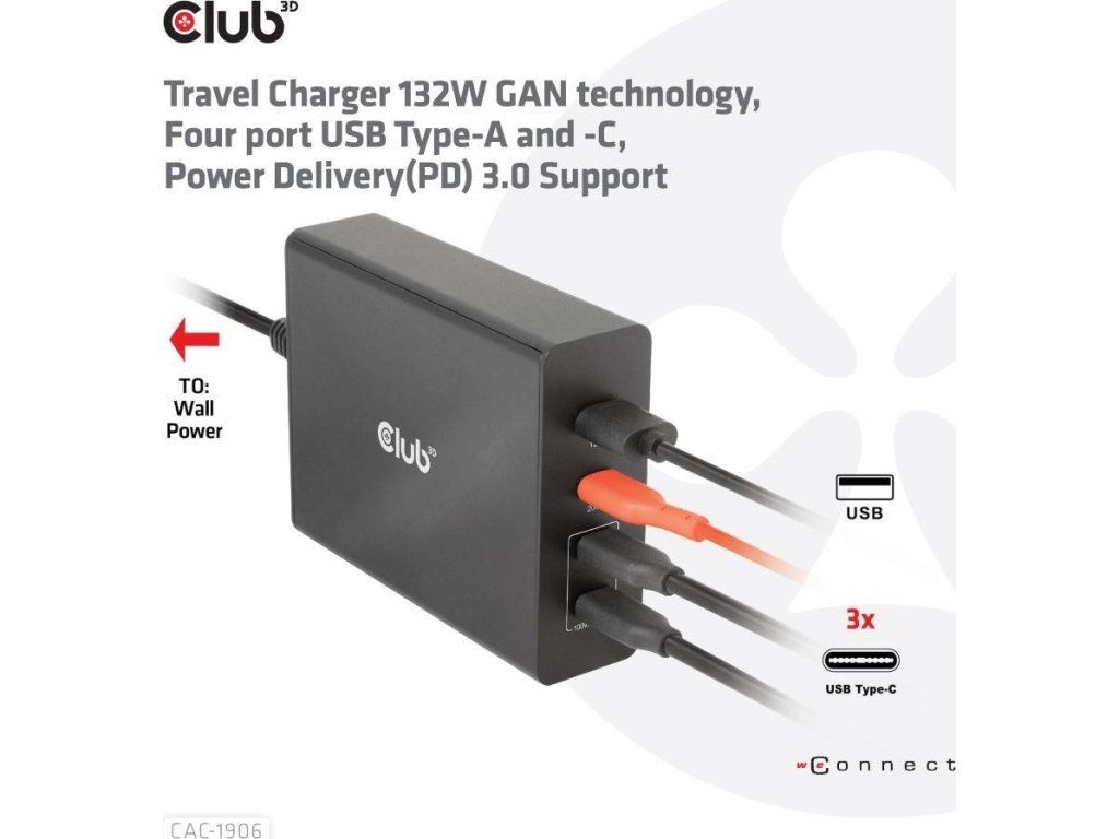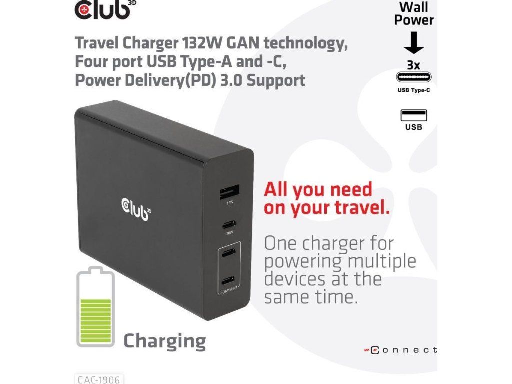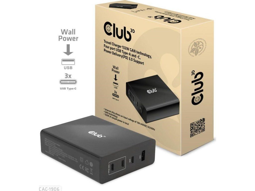 Cestovná nabíjačka Club 3D CAC-1906 132W technológia GAN, štyri porty USB typu A a C, Power Delivery(PD) 3.0 Podpora. Tento produkt je vysoko výkonná cestovná nabíjačka s nízkou hmotnosťou a maximálnym výstupným výkonom 132 W. Vďaka 3 portom USB typu C a 1 portu typu A podporuje celkový výkon až 132 W, čo dokáže uspokojiť potreby nabíjania štyroch zariadení súčasne. Kompatibilita s viacerými zariadeniami (podpora mobilných telefónov, tabletov a notebookov). Je to praktický spoločník na cestách a pri práci! Kompaktné rozmery a vynikajúci výkon: Vďaka technológii GAN je táto nabíjačka o 50 % menšia ako 132W nabíjačka MacBook, dostatočne malá na to, aby ste ju mohli nosiť kamkoľvek so sebou.132W nástenná nabíjačka je vhodná pre rôzne zariadenia PD od smartfónov až po notebooky, pričom nabíjanie je jednoduché pre všetkých. Nabíjačka Power Charger je ľahká bez kompromisov v oblasti kvality a bezpečnosti. Vďaka technológii nabíjania Power Delivery(PD) vám táto univerzálna nabíjačka poskytuje funkciu nabíjania cez rozhranie USB typu C, môžete nabíjať akýkoľvek pripojený mobilný telefón/tablet/notebook.