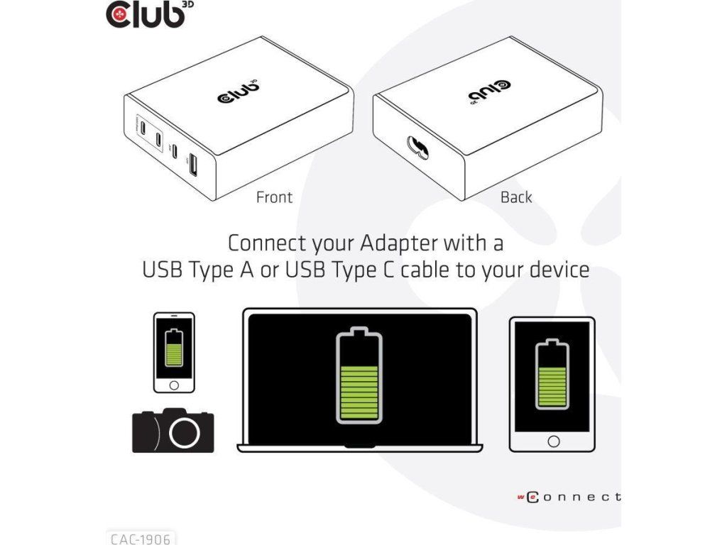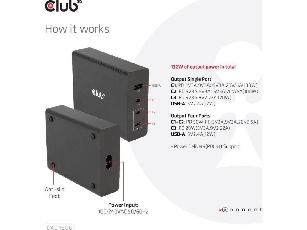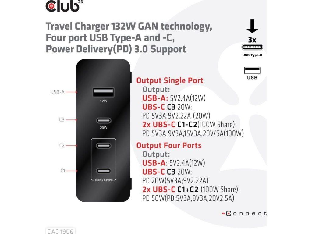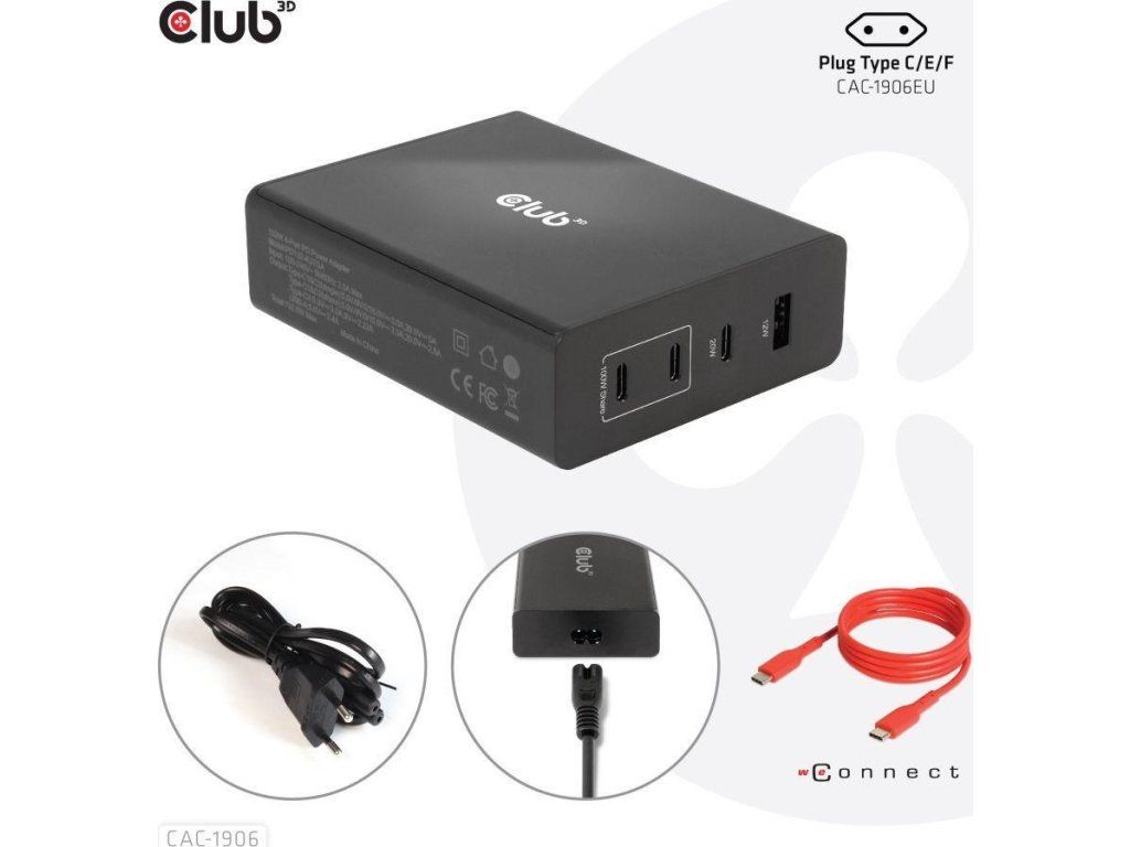 Cestovná nabíjačka Club 3D CAC-1906 132W technológia GAN, štyri porty USB typu A a C, Power Delivery(PD) 3.0 Podpora. Tento produkt je vysoko výkonná cestovná nabíjačka s nízkou hmotnosťou a maximálnym výstupným výkonom 132 W. Vďaka 3 portom USB typu C a 1 portu typu A podporuje celkový výkon až 132 W, čo dokáže uspokojiť potreby nabíjania štyroch zariadení súčasne. Kompatibilita s viacerými zariadeniami (podpora mobilných telefónov, tabletov a notebookov). Je to praktický spoločník na cestách a pri práci! Kompaktné rozmery a vynikajúci výkon: Vďaka technológii GAN je táto nabíjačka o 50 % menšia ako 132W nabíjačka MacBook, dostatočne malá na to, aby ste ju mohli nosiť kamkoľvek so sebou.132W nástenná nabíjačka je vhodná pre rôzne zariadenia PD od smartfónov až po notebooky, pričom nabíjanie je jednoduché pre všetkých. Nabíjačka Power Charger je ľahká bez kompromisov v oblasti kvality a bezpečnosti. Vďaka technológii nabíjania Power Delivery(PD) vám táto univerzálna nabíjačka poskytuje funkciu nabíjania cez rozhranie USB typu C, môžete nabíjať akýkoľvek pripojený mobilný telefón/tablet/notebook.
