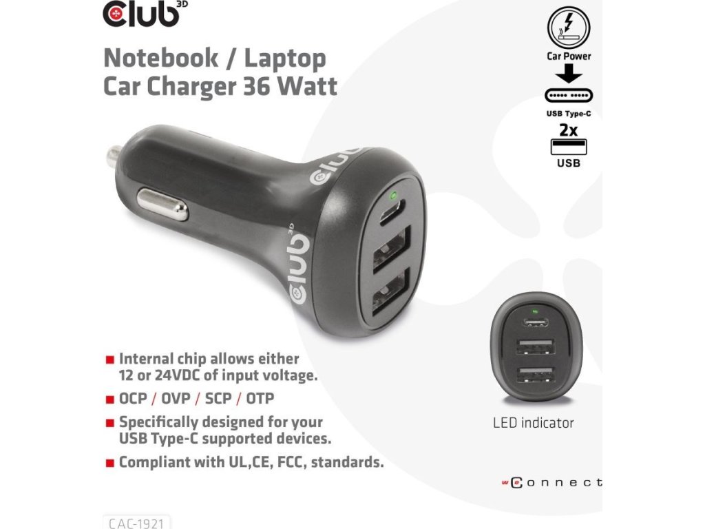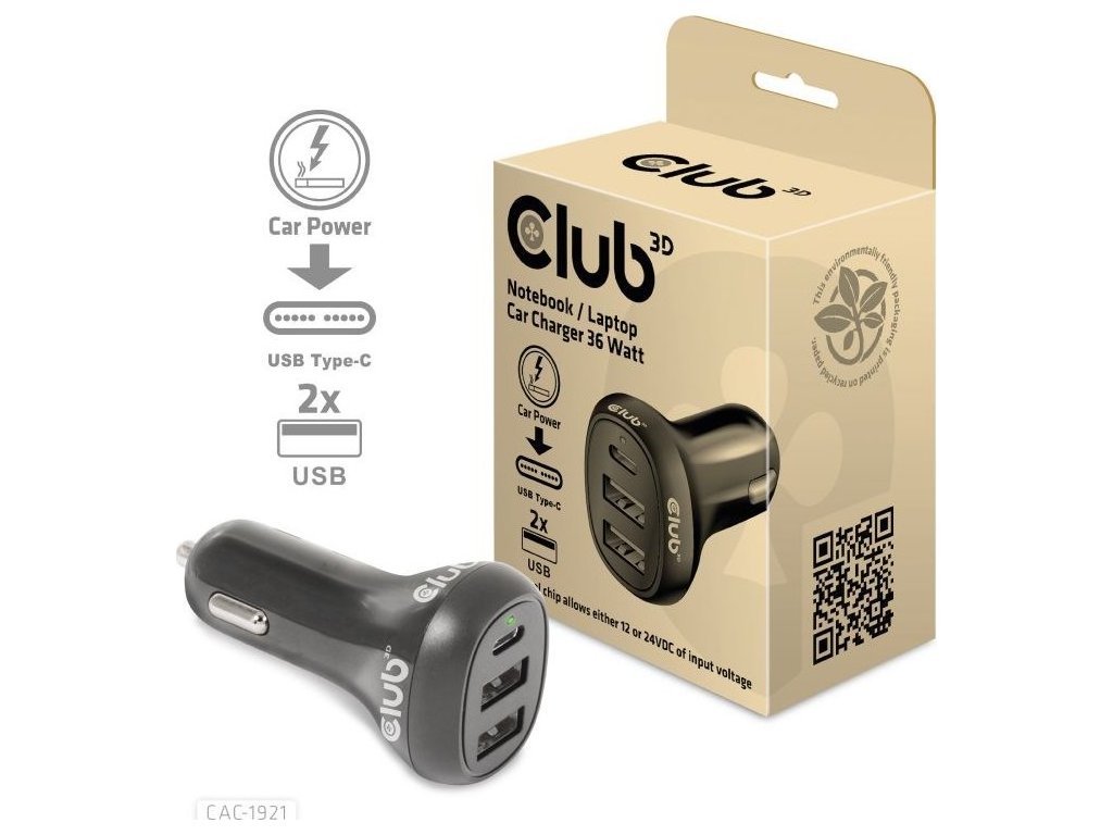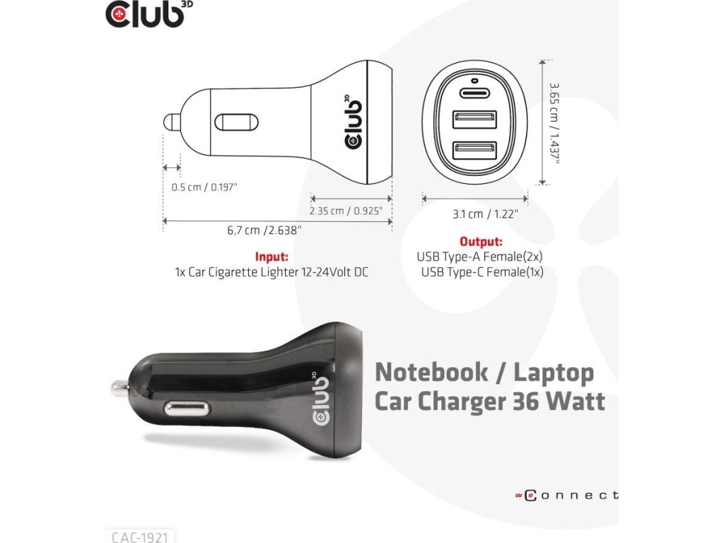 Produkt Club 3D CAC-1921 je vysoko výkonná nabíjačka do auta s módnym dizajnom. S touto nabíjačkou môžete nabíjať akékoľvek zariadenia (napr.: digitálne fotoaparáty, PDA, mobilné telefóny, USB príslušenstvo) s autom, keď je to potrebné. Je vybavená tromi USB konektormi (jeden konektor USB Type-C a dva konektory USB Type-A) na napájanie. Tento produkt umožňuje nabíjanie troch zariadení súčasne a poskytuje maximálny výkon 36 wattov. Port USB Type-C je špeciálne navrhnutý pre zariadenia podporované Type-C. Uistite sa, prosím, že používate káble s správnym výkonom od Club 3D. Odporúčame používať minimálne 60W káble, aby ste sa uistili, že optimálne využívate výhody tejto nabíjačky. Je to užitočné a pohodlné použitie!