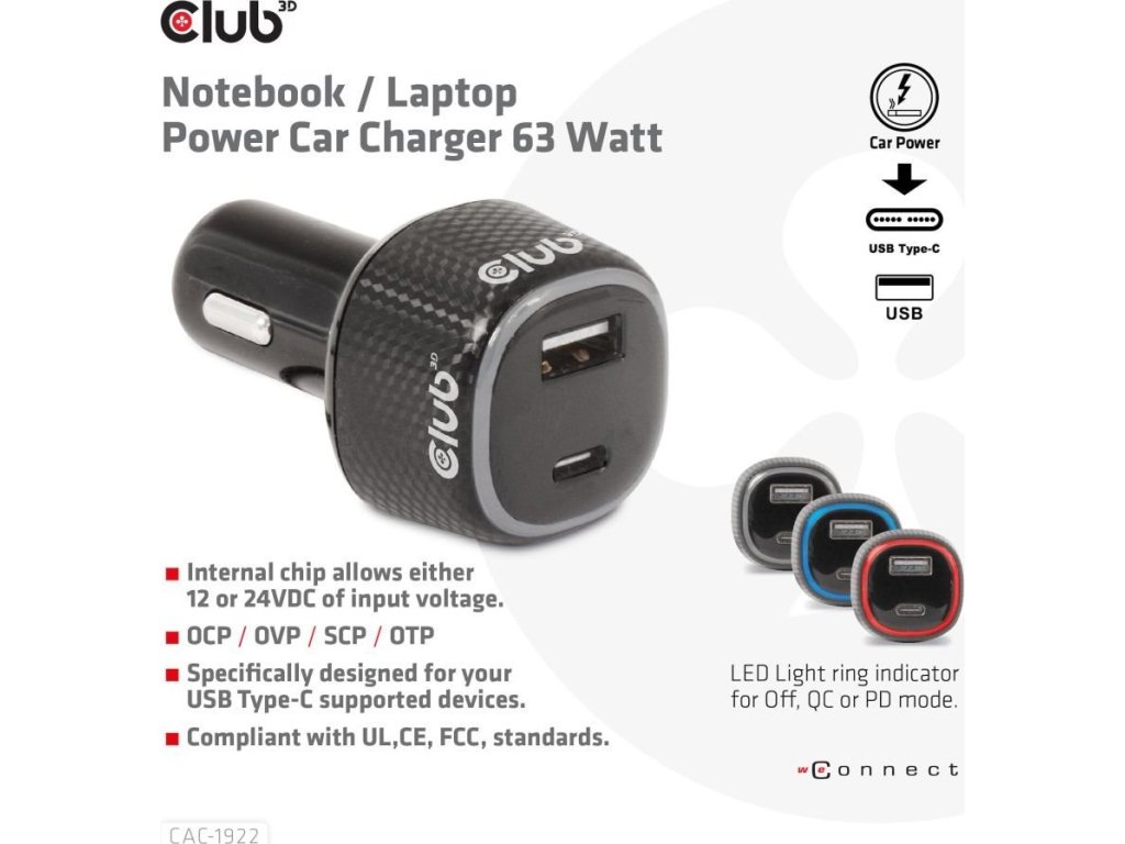 Club 3D CAC-1922 je vysoko výkonná a módna dizajnová max. 63W nabíjačka do auta s podporou QC3.0 a Power Delivery (PD). S touto nabíjačkou môžete nabíjať akékoľvek zariadenia (napríklad digitálne fotoaparáty, PDA, notebooky, mobilné telefóny, USB príslušenstvo) s vaším autom, keď je to potrebné. Je vybavená dvomi USB konektormi (jeden konektor USB Type-C a jeden konektor USB Type-A) na napájanie. Tento produkt umožňuje nabíjať dve zariadenia súčasne a dosahuje maximálny výkon 63 wattov. Port USB-C je špeciálne navrhnutý pre zariadenia s podporou typu C. Aby sa rozlíšilo medzi QC a PD nabíjaním, LED kontrolka sa rozsvieti modro pre Quick Charge (QC) alebo červeno pre Power Delivery (PD).