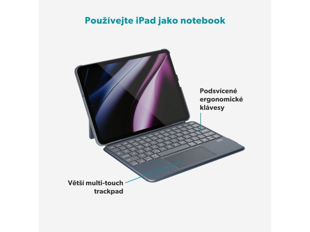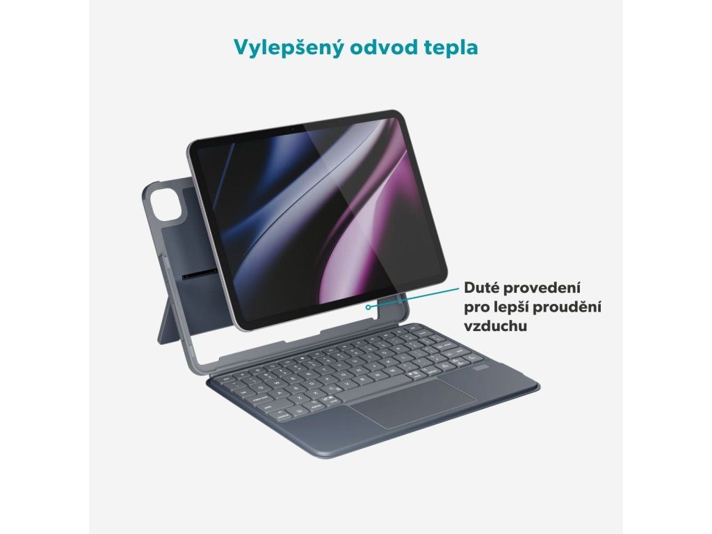 Klávesy s vylepšenou ergonomií zajišťují plynulé a pohodlné psaní, zatímco polohovatelný stojánek poskytne ideální úhel pro práci i sledování obsahu. Nezávislá baterie klávesnice vydrží až 5 hodin provozu s podsvícením nebo 55 hodin bez něj a rychle se dobíjí přes USB-C kabel, který je součástí balení. Spolehlivé Bluetooth připojení zajistí bezdrátovou svobodu a pracovní prostor bez zbytečných kabelů. Duté provedení stojánku navíc podporuje lepší proudění vzduchu a chrání zařízení před přehříváním.