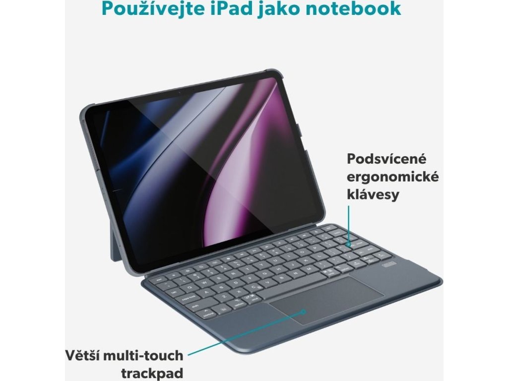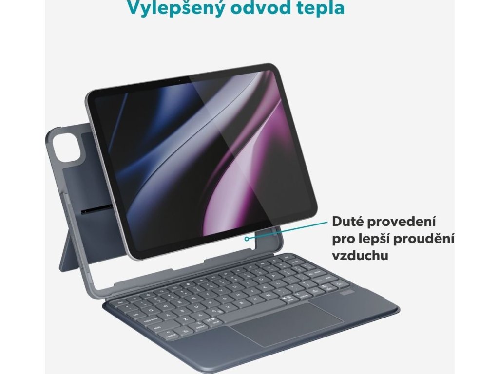 Klávesy s vylepšenou ergonomií zajišťují plynulé a pohodlné psaní, zatímco polohovatelný stojánek poskytne ideální úhel pro práci i sledování obsahu. Nezávislá baterie klávesnice vydrží až 5 hodin provozu s podsvícením nebo 55 hodin bez něj a rychle se dobíjí přes USB-C kabel, který je součástí balení. Spolehlivé Bluetooth připojení zajistí bezdrátovou svobodu a pracovní prostor bez zbytečných kabelů. Duté provedení stojánku navíc podporuje lepší proudění vzduchu a chrání zařízení před přehříváním. Klávesnice je dostupná v českém, slovenském i německém rozložení kláves.