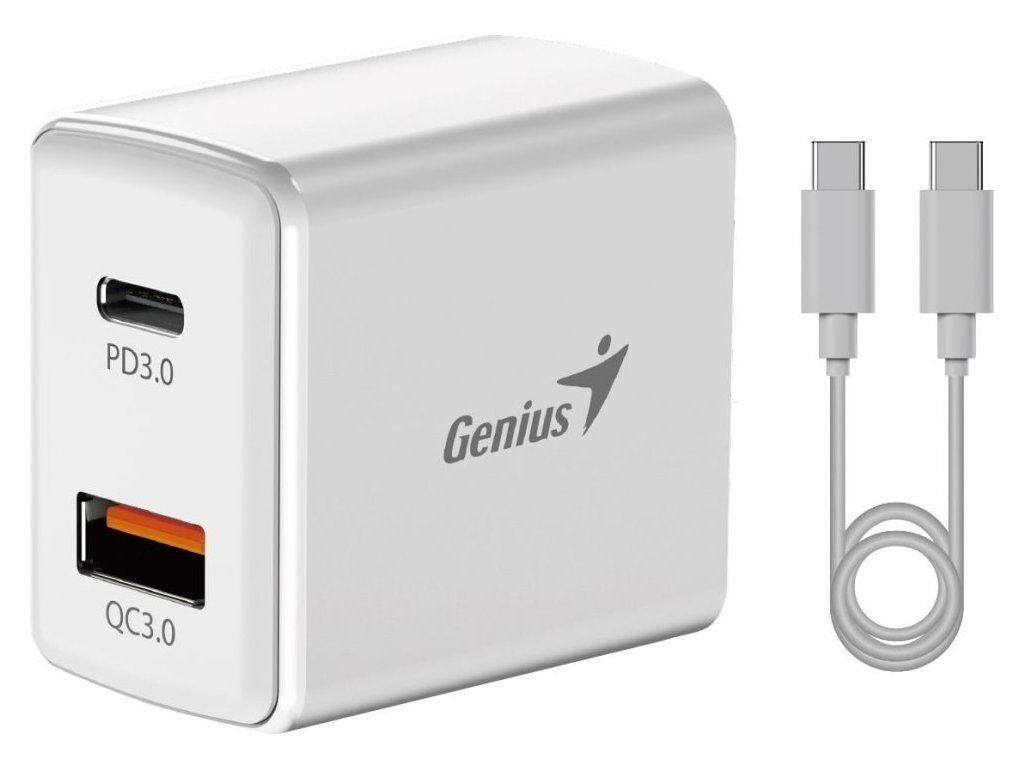GENIUS nabíjecí set PD-20ACP, 20W, rychlé nabíjení, USB-C PD3.0, USB-A QC3.0, 1m kabel USB-C USB-C, bílá