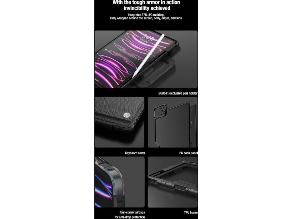 Nillkin Bumper Go Keyboard Case je víceúčelový ochranný kryt tabletu s odnímatelnou podsvícenou klávesnicí, slotem pro Apple Pencil a plynule nastavitelným úhlem tabletu.