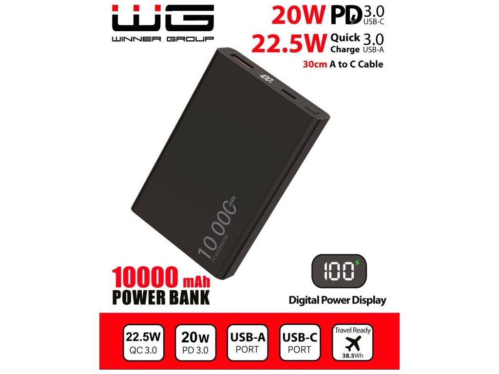 WG - Power Bank 10000 mAh, USB-C PD 20W + USB-A 22.5W, černá
