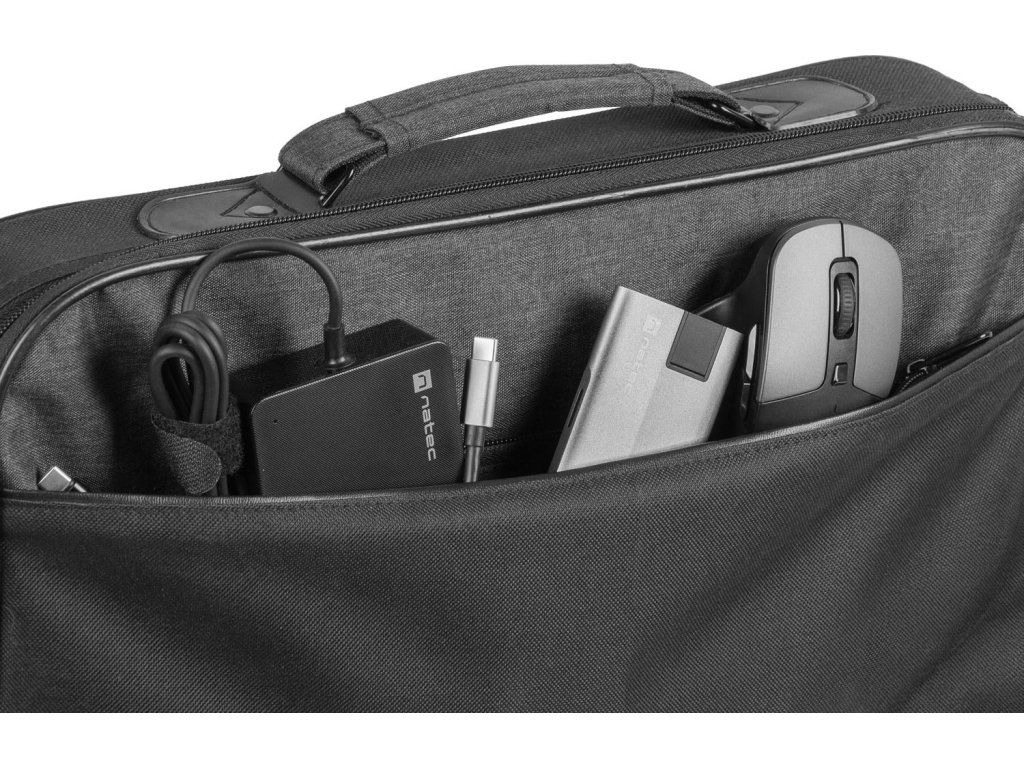 Brašna byla navržena tak, aby se do ní snadno vešel nejen notebook s maximální úhlopříčkou 17,3", ale také napájecí adaptér a další příslušenství. Kromě mobilního počítače v ní můžete přenášet i další důležité věci - díky přední přihrádce na zip, kam můžete schovat například dokumenty.
