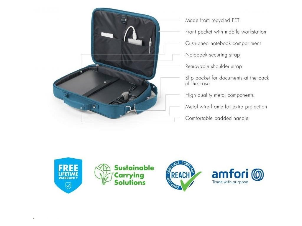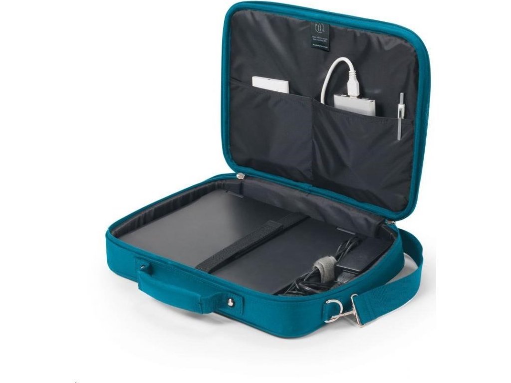 Kompaktné puzdro Eco Multi BASE ponúka ideálnu ochranu pre váš notebook vďaka polstrovanej priehradke na notebook. Puzdro plne chráni zariadenia od 14 do 15 rokov.6" a elastický popruh ich tiež upevňuje v priehradke. Základňa Eco Multi BASE zaručuje extra stabilitu a ochranu vďaka kovovému rámu, ako aj flexibilnú mobilitu vďaka ľahkej konštrukcii. Smartfón alebo iné menšie predmety, ako sú káble, perá alebo nabíjačky, si môžete uložiť do praktického predného vrecka, aby ste ich mali vždy po ruke. Vďaka rukovätiam sa kufor pohodlne prenáša a pomocou zabudovaného popruhu ho možno v priebehu niekoľkých sekúnd pripevniť ku kufru. Dá sa prenášať aj pomocou nastaviteľného ramenného popruhu. Eco Multi BASE je preto ideálny pre vás, ak ste vždy na cestách a chcete podporiť recykláciu PET fliaš ekologickým puzdrom.