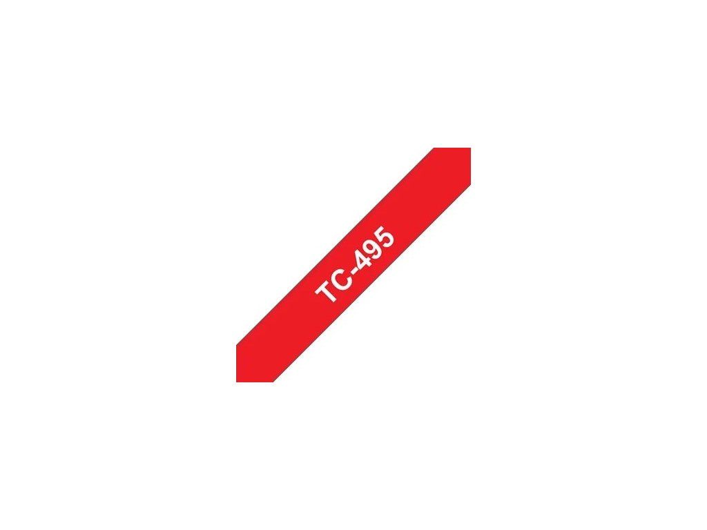 Laminovaná páska Brother TC495 se standardním lepidlem pro tisk štítků, bílý tisk na červeném podkladu – šířka 9 mm