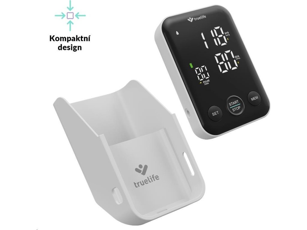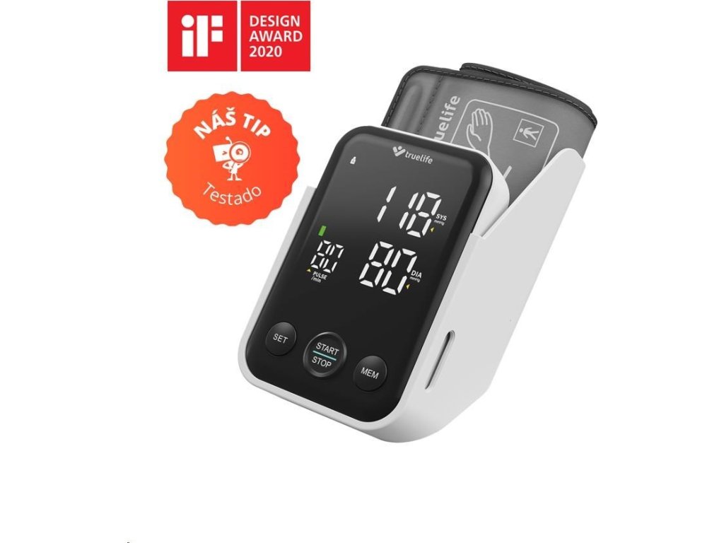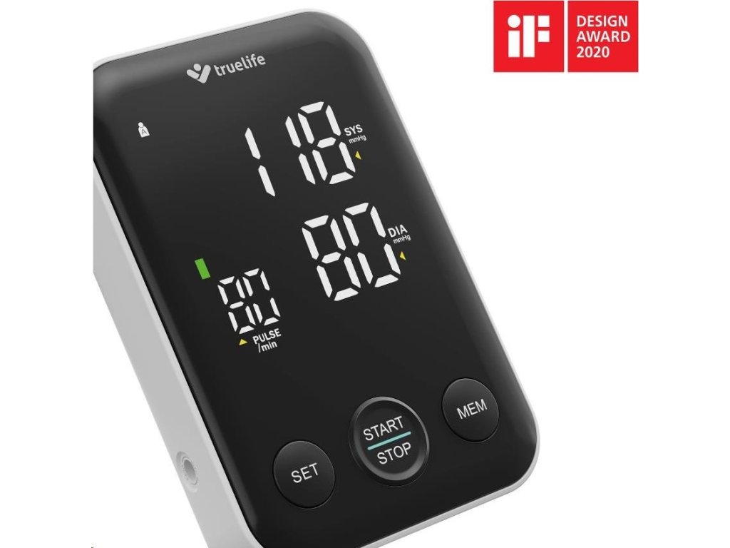 Tlakomer TrueLife Pulse B-Vision je bez pochyby jedinečný svojim dizajnom, o čom svedčí aj prestížne ocenenie Design Award. LED displej, ktorý slúži k zobrazeniu nameraných hodnôt je dostatočne veľký a vďaka čierno-bielemu kontrastnému prevedeniu aj veľmi prehľadný. Súčasťou balenia je praktický stojan, do ktorého jednoducho uložíte tlakomer aj manžetu.