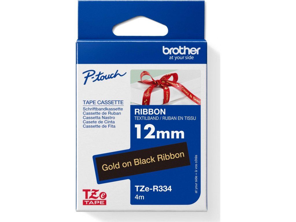 BROTHER TZE-R334 - 12 mm široká kazeta s TZ páskou, 4 m TEXTILNÁ páska - na výrobu darčekov - NEŠPECKOVATÁ - ČIERNA PÁSKA, ZLATÝ POTISK