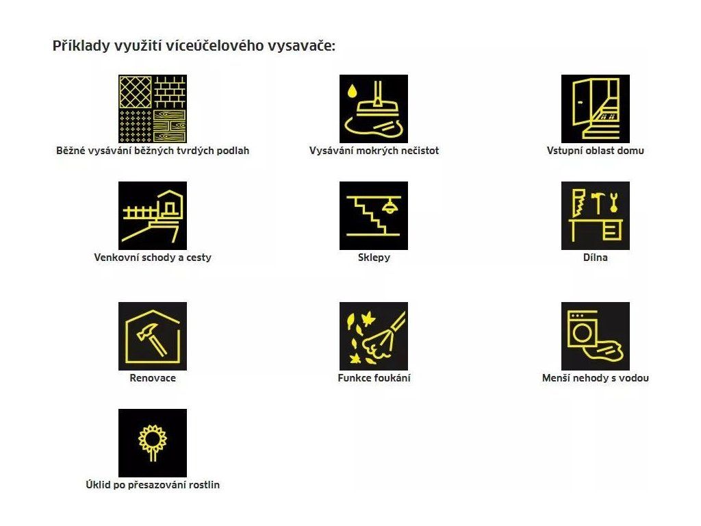 mokré, jemné alebo hrubé nečistoty so spotrebou 1100 wattov. Zariadenie je dodávané s robustnou plastovou nádobou objemu 25 litrov, 5-metrovou šnúrou, 2,2-metrovou sacou hadicou s odnímateľnou,