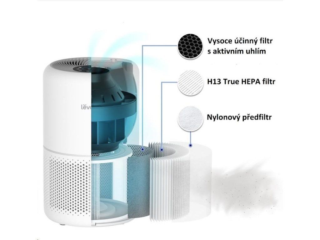 Druhou vrstvou je HEPA filter H13. To odlišuje Levoit od konkurencie, pretože filter HEPA H13 je oveľa kvalitnejší a spoľahlivejší ako bežne používané HEPA H11. Tu sa odfiltrujú jemné prachové častice, pleseň, baktérie, peľ, dymové častice, roztoče a srsť.