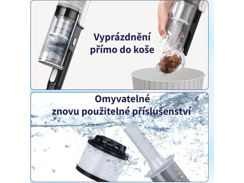 LVAC200 možno vyprázdniť priamo do koša stlačením tlačidla. Jeho filtre a kefy sú tiež umývateľné. Hygiena zaručená.