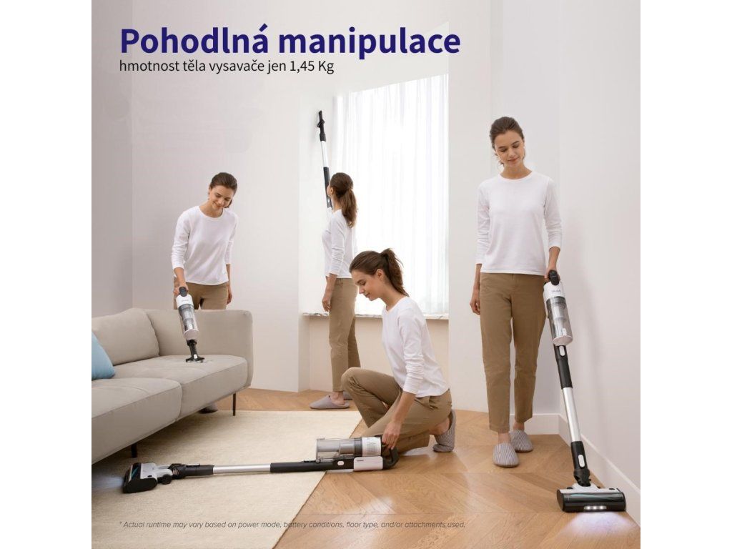 Vysávač je vybavený 180 W bezkartáčovým motorom napájaným z 2200 mAh batérie. Vďaka kombinácii moderného motora a veľkej batérie je vysávač nielen tichý, ale čo je dôležitejšie, vydrží naozaj dlho. Počas bežného upratovania dokáže vysávať až 50 minút, a to je dostatočný čas na vyčistenie celej plochy. Motor má 100 000 otáčok a poradí si aj s ťažšími nečistotami, ako je piesok a iný vonkajší materiál.