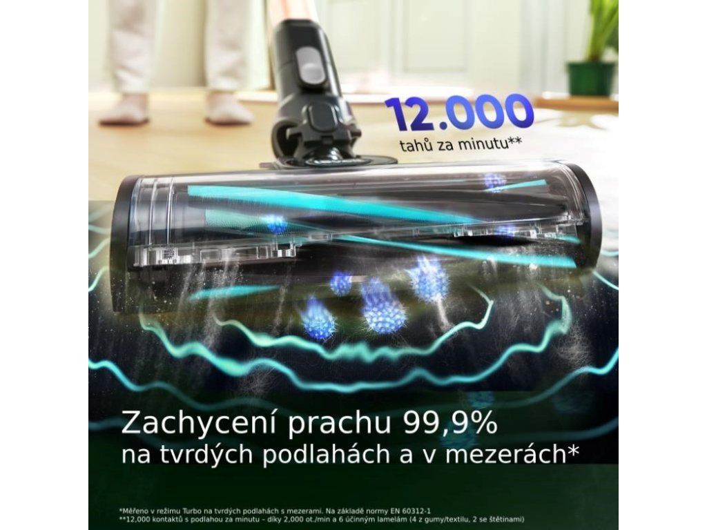 Vysavač je vybavený 240 W bezkartáčovým motorem, který pohání 3000 mAh baterie. Díky kombinaci moderního motoru a velké baterie je vysavač je tak nejen tichý, ale hlavně vydrží pracovat opravdu dlouho. Při běžném úklidu vydrží vysávat až 60 minut, a to stačí na úklid celého prostoru. Kartáč vysavače vyvine až 12.000 kontaktů lamel a kartáče s podlahou za minutu, takže nečistoty nemají šanci.