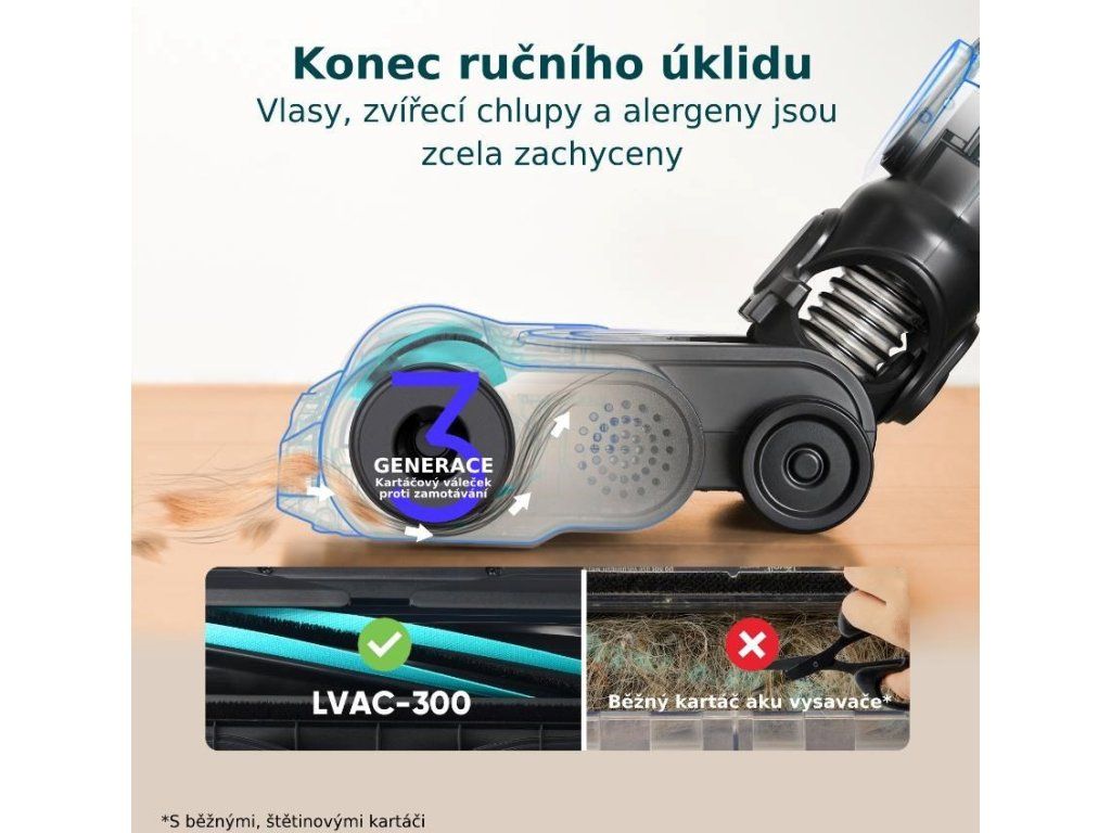 Rotační kartáč byl navržen abyste nemuseli neustále odmotávat vlasy a chlupy. Zároveň ale jeho textilní a gumové lamely fungují perfektně pro jejich odstranění. Vestavěný hřeben vlasy i srst od kartáče separuje do odpadní nádoby a udržuje ho tak čistý. LVAC 300 je ideálním nástrojem do domácnosti se zvířaty.