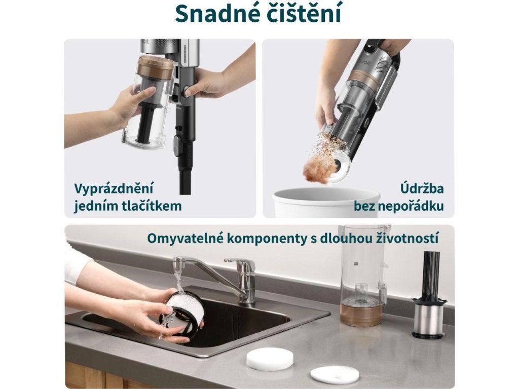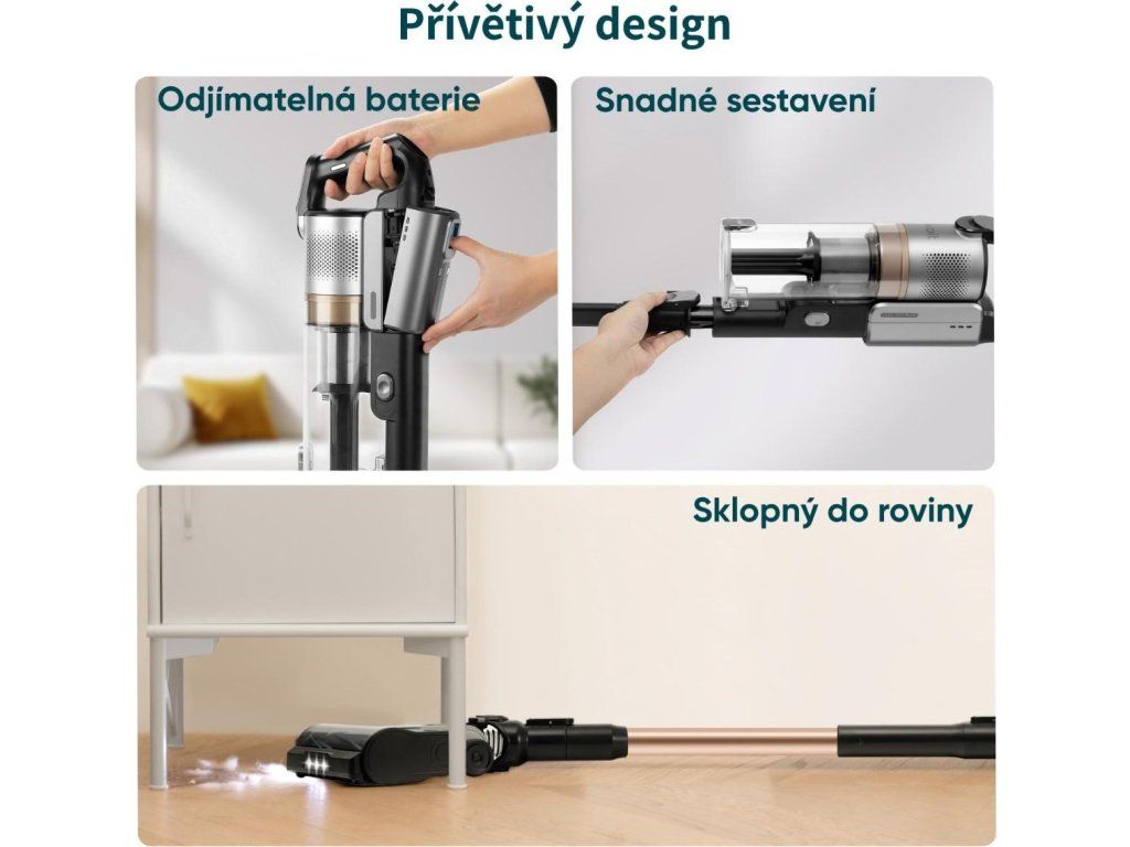 Promyšlený design vysavače usnadňuje každodenní používání – baterii jednoduše odejmete a dobijete samostatně, bez nutnosti manipulace s celým přístrojem. Díky plochému kloubu dosáhnete i pod nízký nábytek, kam se běžný vysavač nedostane. Sestavení a výměna nástavců je otázkou vteřin, takže můžete plynule přecházet mezi různými typy úklidu bez zdržování.