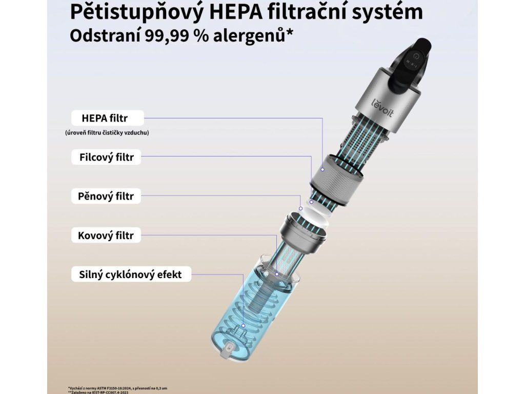 Vysavač Levoit LVAC300 filtruje nečistoty v pěti stupních a na konci je vybavený HEPA filtrem se záchytem 99,99 % částic nad 3 mikrony. Snadno si poradí s běžnými alergeny jako je zvířecí srst a zbytky kůže, prachy, pyl a roztoči.