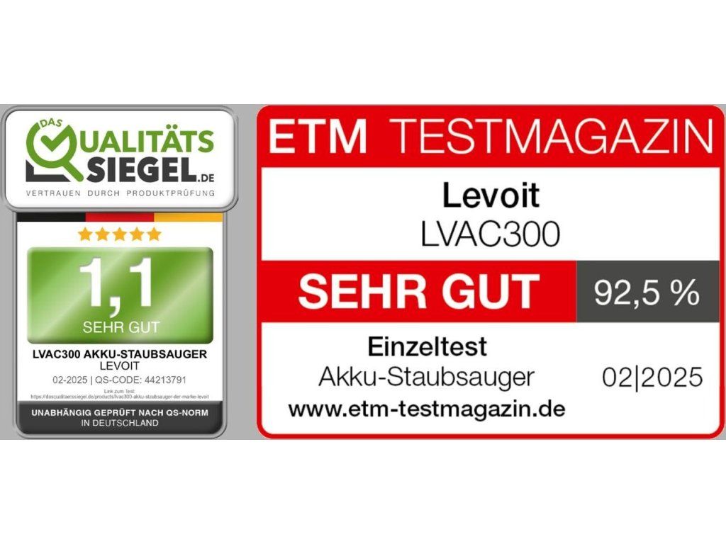 V nezávislém testu německého ETM Testmagazin dosáhl Levoit LVAC-300 vysokého hodnocení 92,5 % a známky SEHR GUT. V testu byla například naměřena ještě nižší hlučnost, než udává výrobce, a to ve všech režimech. V režimu ECO dokonce 68,9 dB. Dále vysavač získal hodnocení 1,1 v dalším německém testu, Qualitaets Siegel.