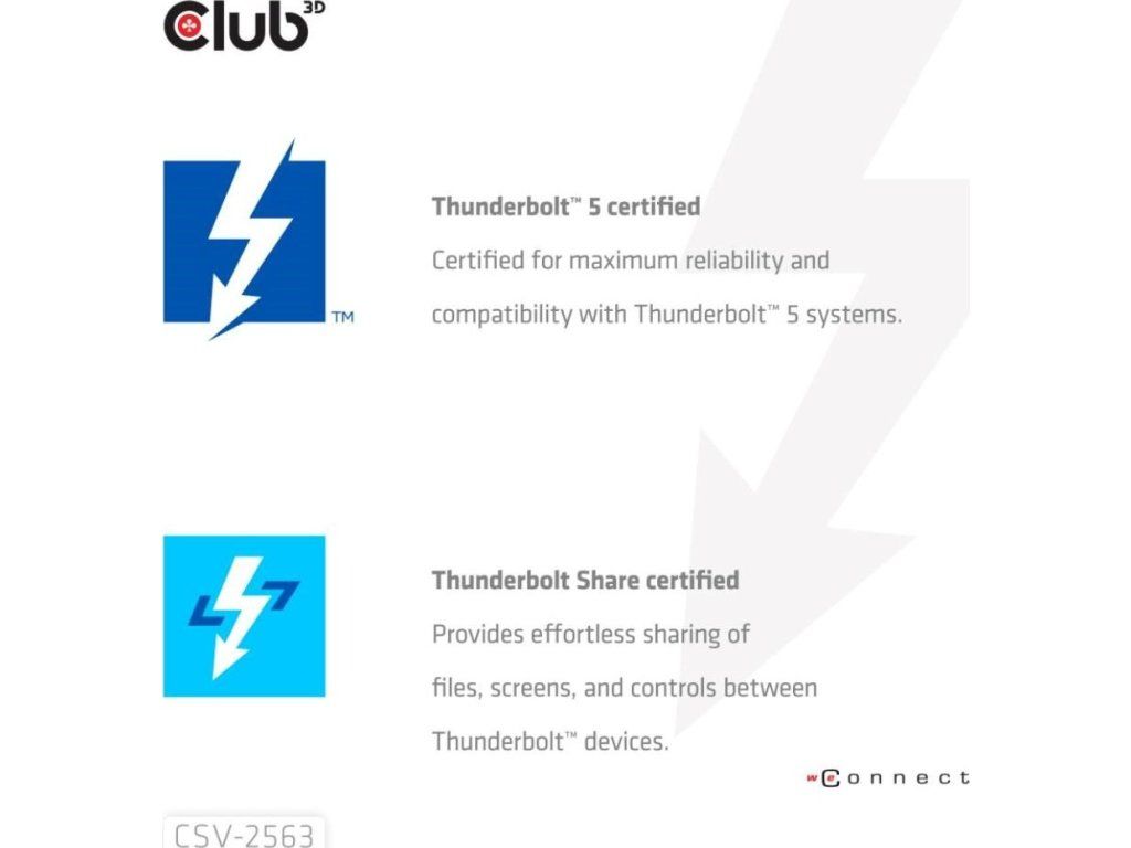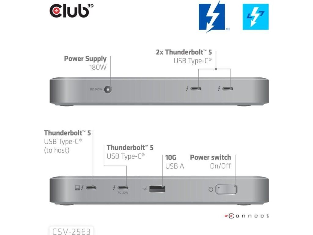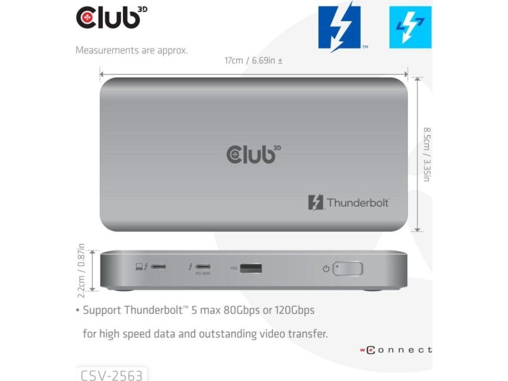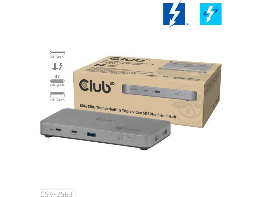 Club 3D CSV-2563 je certifikovaný prenosný Thunderbolt 5 hub, ktorý ponúka najpokročilejšie, najefektívnejšie a najvšestrannejšie riešenia vstupov a výstupov – s rýchlosťou až 80 Gb/s alebo 120 Gb/s pre prenos dát a videa.