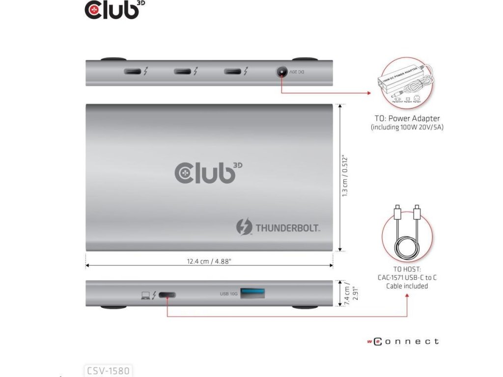 Club 3D CSV-1580 je certifikovaný prenosný rozbočovač Thunderbolt™ 4, ktorý poskytuje najpokročilejšie, najefektívnejšie a najvšestrannejšie dostupné I/O riešenie s rýchlosťou až 40 Gb/s pre dáta a video. Tento moderný rozbočovač Thunderbolt™ 4 má po prvýkrát 3 nadväzujúce porty Thunderbolt™ 4, ktoré umožňujú kaskádové pripojenie zariadení Thunderbolt™ 4 k jednému 8K30Hz alebo dvom 4K60Hz monitorom, možno ho tiež ľahko pripojiť k akémukoľvek zariadeniu USB typu C a súčasne nabíjať počítač. Okrem toho podporuje funkciu Smart Power, ktorá umožňuje rozdeľovať energiu podľa spotreby pripojeného zariadenia a plne tak využívať externý zdroj napájania. Je určený pre počítače PC s rozhraním Thunderbolt™ 4 a počítače Mac™ s rozhraním Thunderbolt™ 3, ktoré používajú systém macOS™ 11 a novšie verzie.