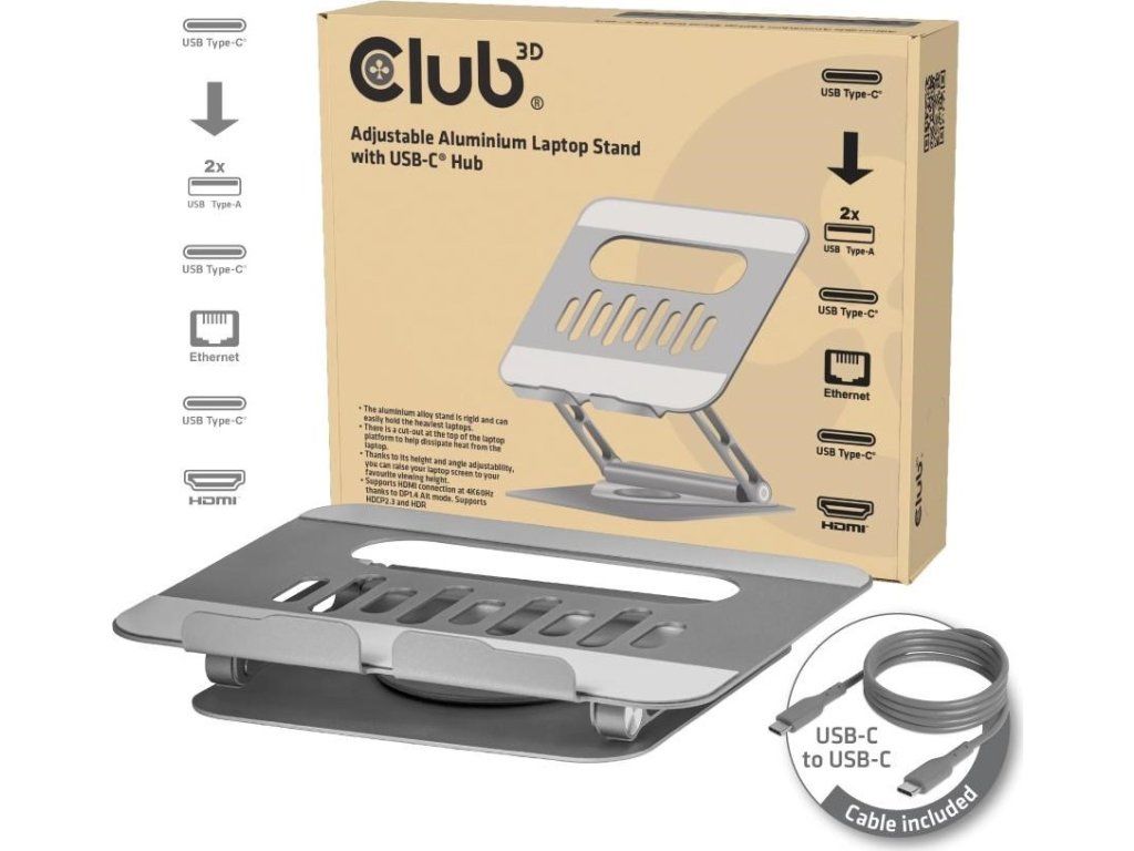 Club3D Nastavitelný hliníkový stojan pro notebook s USB-C hubem na 2xUSB, 1xHDMI, 2xUSB-C, 1xRJ45, 360°, 100W, 4K60Hz