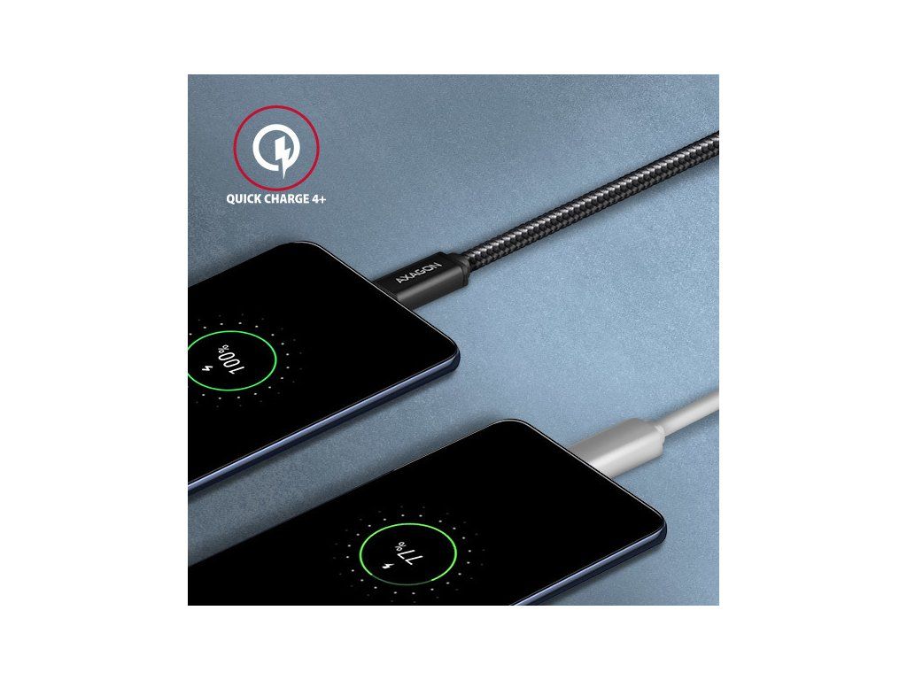 Napájacie vodiče 22AWG (nižšie číslo = väčší prierez a nižší odpor vodiča) zaručujú rýchle nabíjanie telefónov a iných mobilných zariadení. Kábel podporuje aj nabíjanie notebookov technológiou Power Delivery 60W. Dátové vodiče 30AWG spolu s kvalitným tienením zaisťujú spoľahlivý prenos dát. Trojité tienenie chráni prenášané signály pred nepriaznivým rušením.