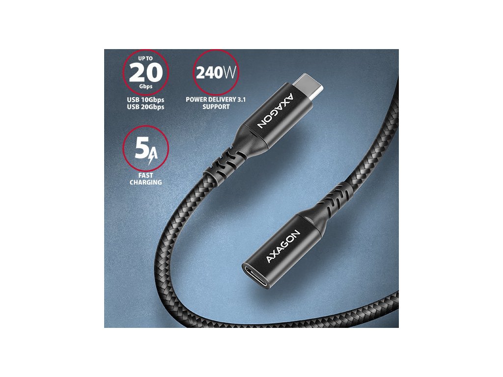 AXAGON BUCM32-CF10AB predlžovací kábel USB-C (M) <-> USB-C (F), 1m, USB 20Gbps, PD 240W 5A, 8K HD, ALU, oplet, čierny