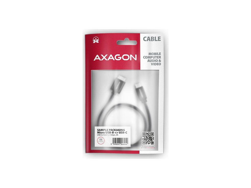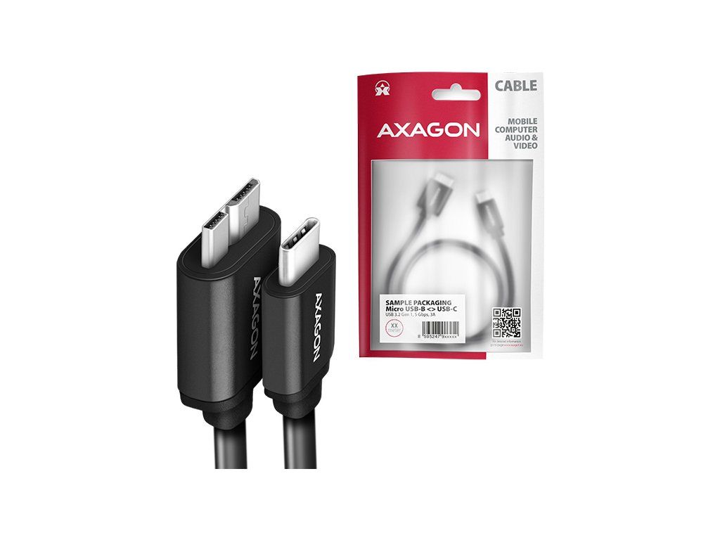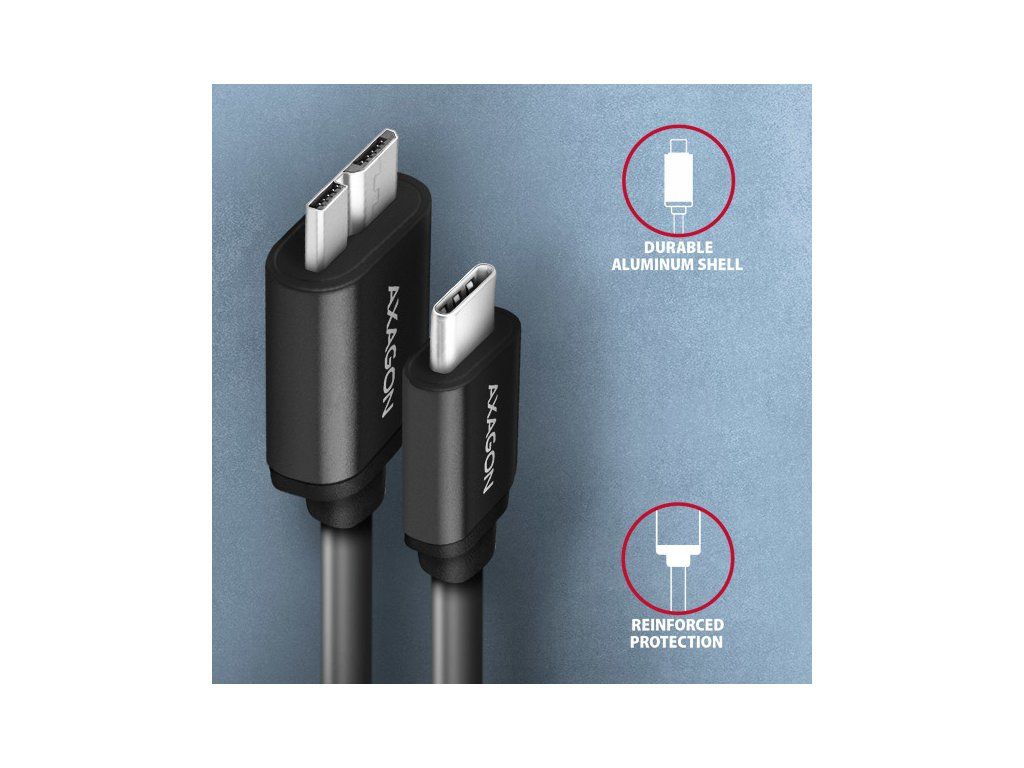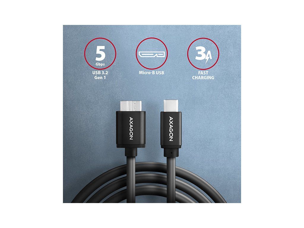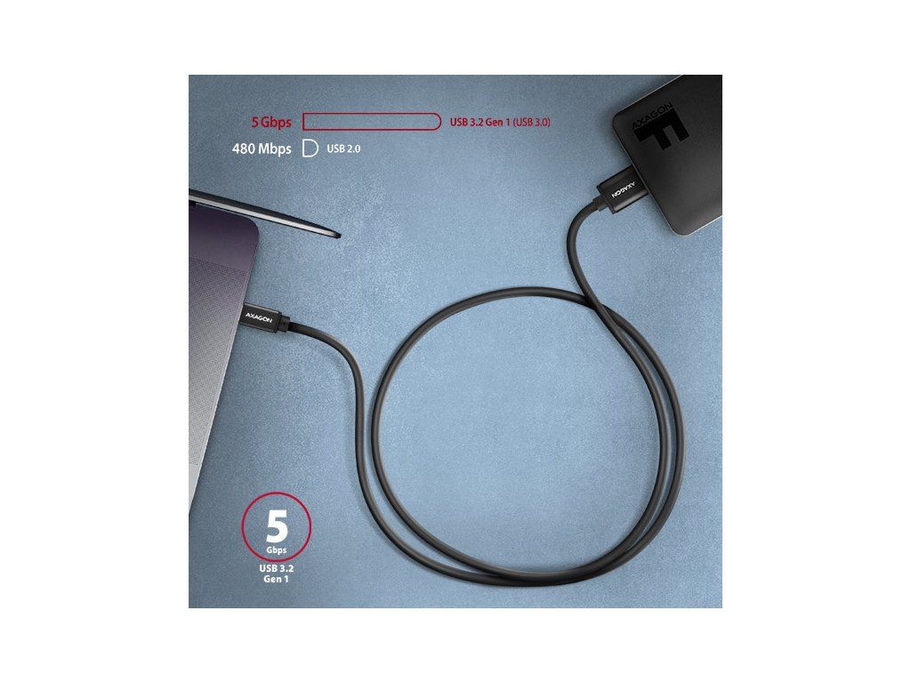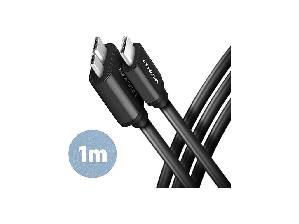 Prémiový dátový a napájací adaptér Micro-B USB <-> USB-C AXAGON BUMM3-CM10AB SPEED USB 3.0 kábel s konektormi Micro-B USB samec a USB-C samec. Kábel je určený na rýchly prenos dát a na napájanie externých pevných diskov a iných mobilných zariadení. Podporuje prenos dát rýchlosťou až 5 Gb/s a napájanie až do 3 A.