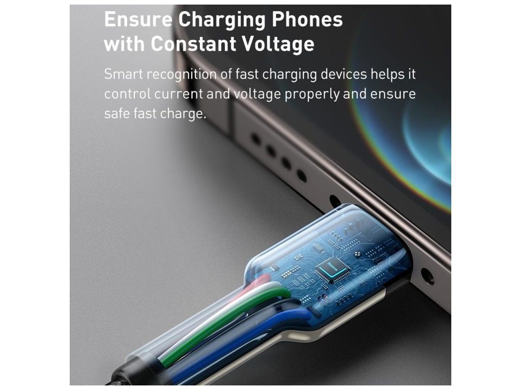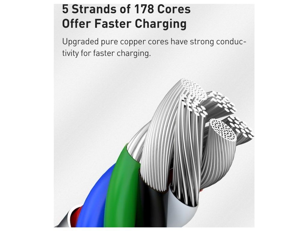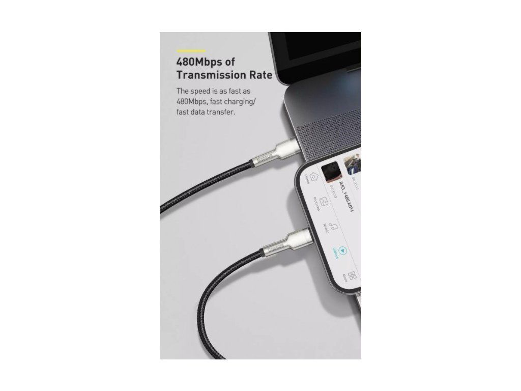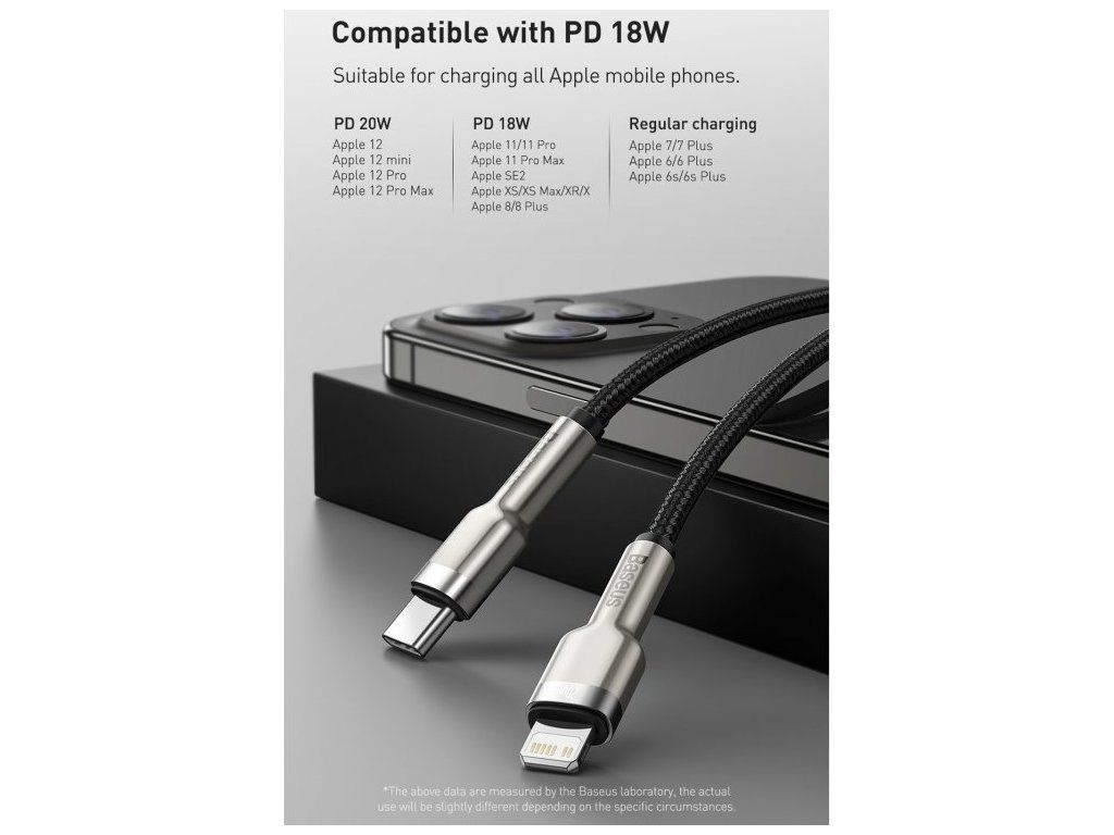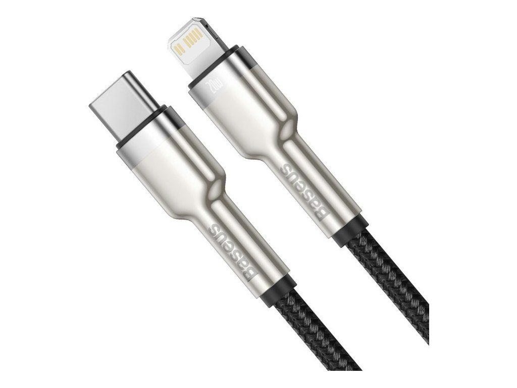 Flexibilný a odolný kovový kábel Baseus Cafule s konektormi USB-C a Lightning umožňuje prenášať dáta a nabíjať batériu v zariadeniach Apple.