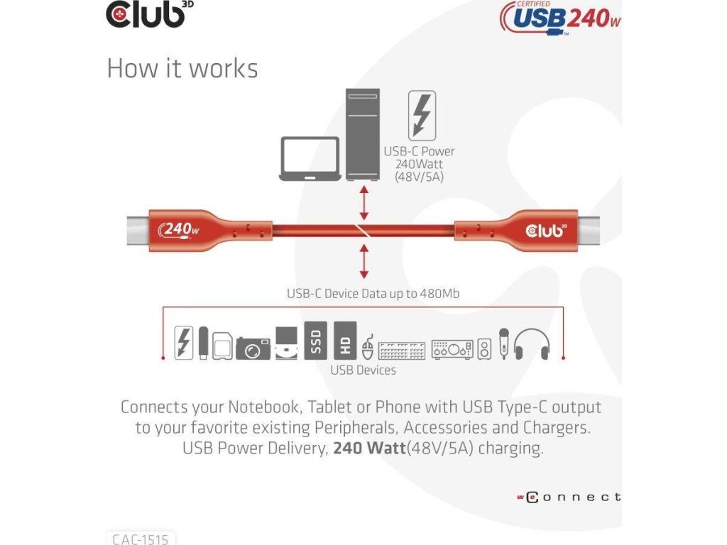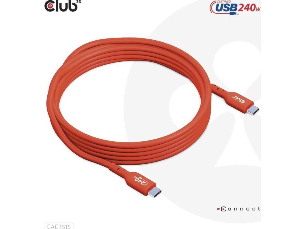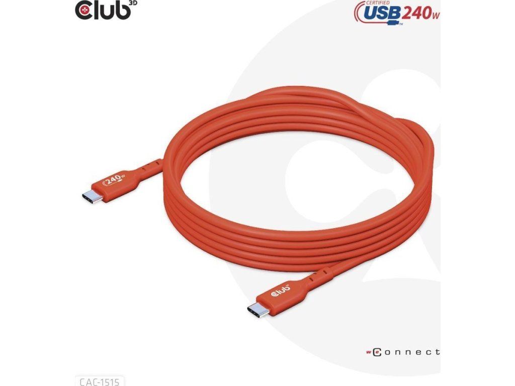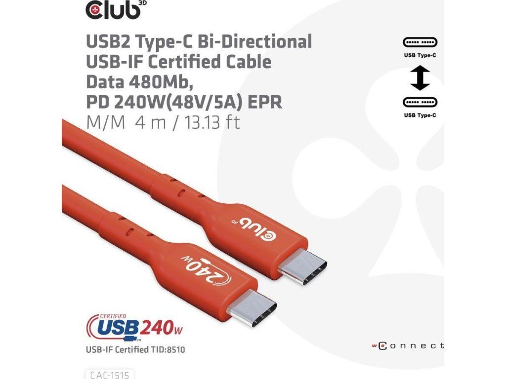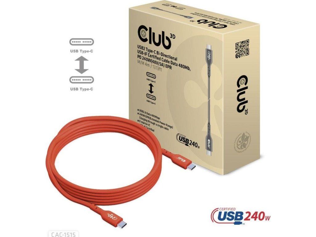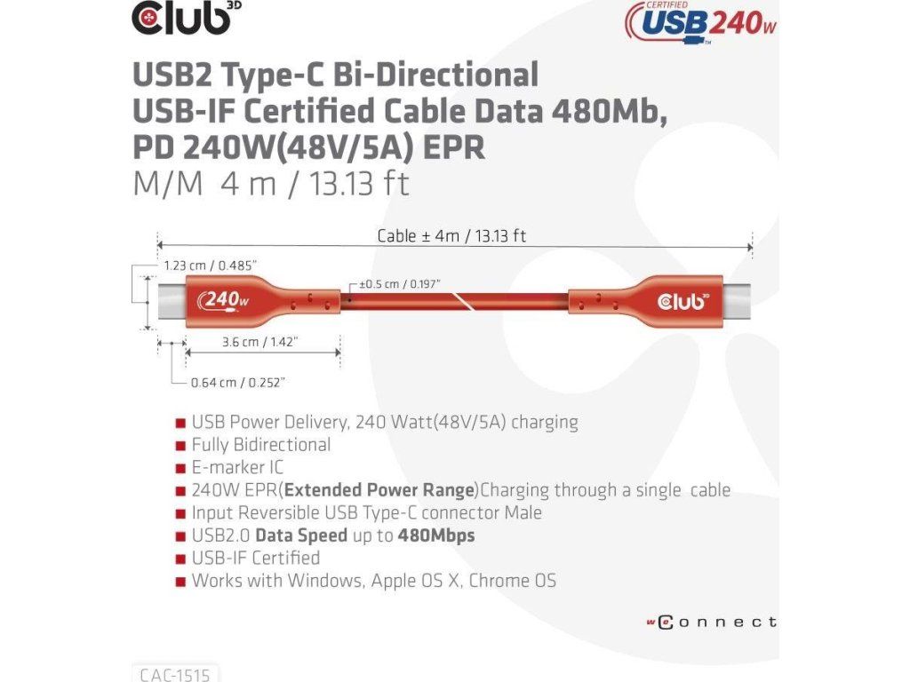 Club3D kabel USB-C, Oboustranný USB-IF Certifikovaný data kabel, PD 240W(48V/5A) EPR M/M 4m