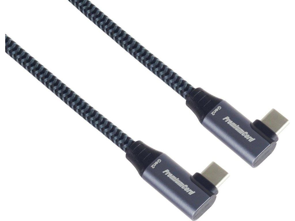 PremiumCord USB-C 2x zahnutý 90° kábel ( USB 3.2 GEN 2x2, 5A, 100W, 20Gbit/s ) hliníkové kryty konektorov, bavlnený opletenie, 2m