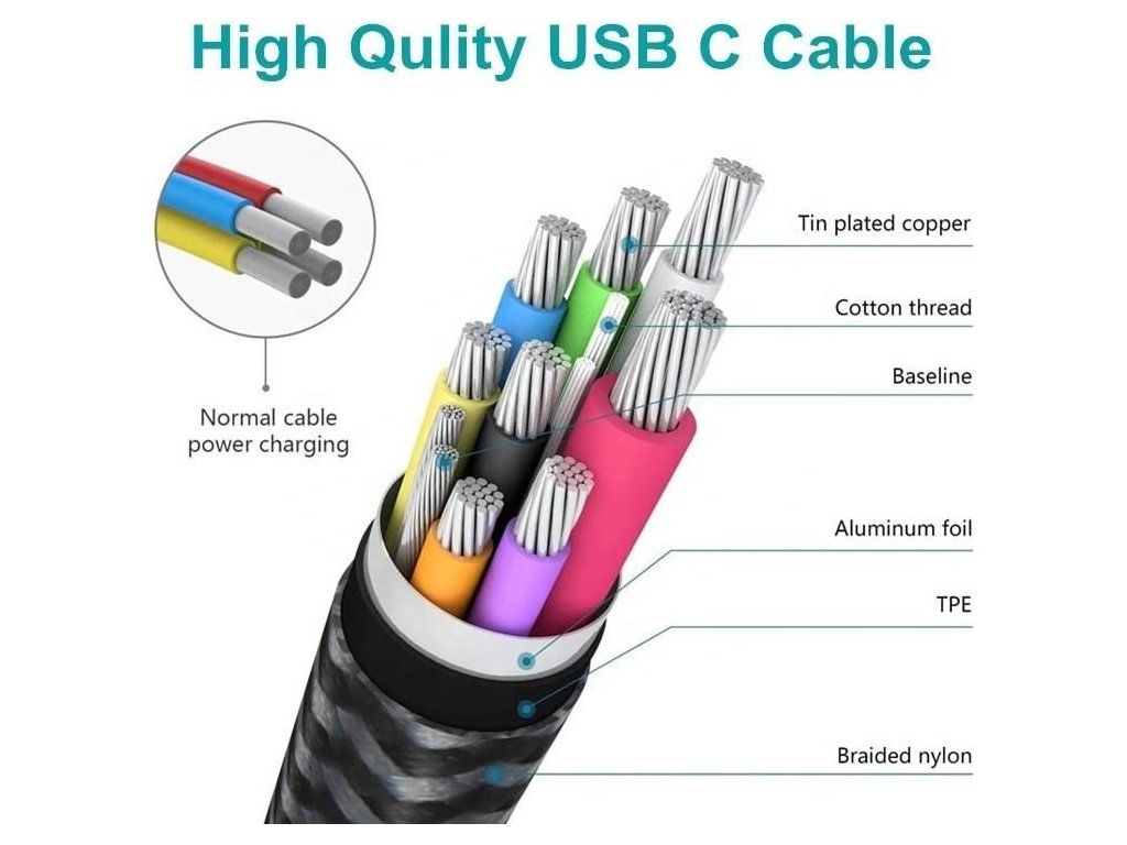 - Kábel je vybavený E-Mark čipom – riadiacou elektronikou, ktorá zabezpečuje komunikáciu pripojených zariadení. Takto je možné dosiahnuť maximálnu možné rýchlosť prenosu dát a nabíjania.