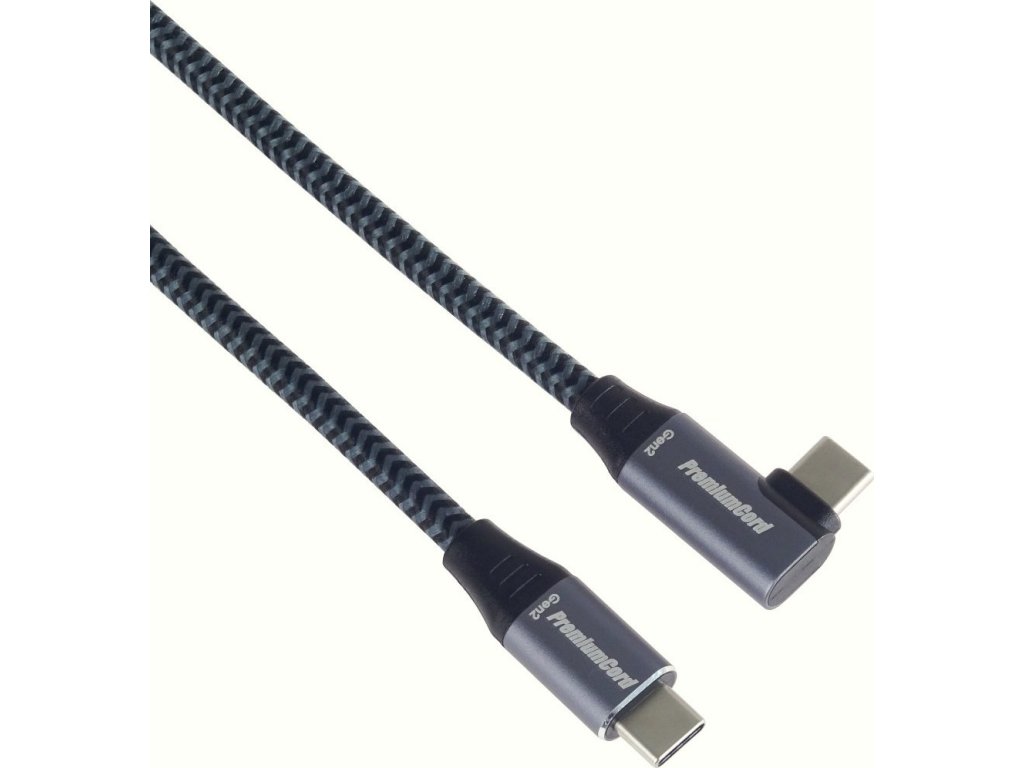 PremiumCord USB-C zahnutý 90° kábel ( USB 3.2 GEN 2x2, 5A, 100W, 20Gbit/s ) hliníkové krytky konektorov, bavlnené opletenie, 3m