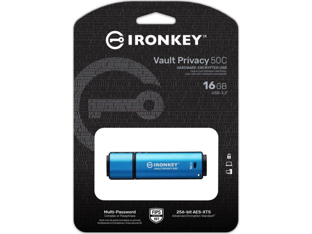 Kingston IronKey™ Vault Privacy řady 50C jsou špičkové disky USB Type-C®, které zajišťují zabezpečení Enterprice-Grade úrovně pomocí 256bitového hardwarového šifrování AES s certifikací FIPS 197 v režimu XTS, včetně zabezpečení proti BadUSB pomocí digitálně podepsaného firmwaru a ochrany proti útoku na heslo hrubou silou. Na VP50 byly provedeny zkoušky prolomení pro zabezpečení na Enterprice-Grade úrovni Vzhledem k tomu, že se jedná o šifrované úložiště pod fyzickou kontrolou uživatele, je řada VP50 při ochraně dat lepší než používání internetu a cloudových služeb.