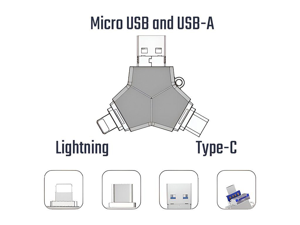 Nový, moderný a mimoriadne ľahký USB FLASH DISK 4v1 s APPLE LIGHTNING / MICRO USB / USB-C / USB 3.0 s internou pamäťou 32 GB, 64 GB, 128 GB. Ideálne na spoľahlivé zálohovanie a prenos údajov z akéhokoľvek zariadenia.