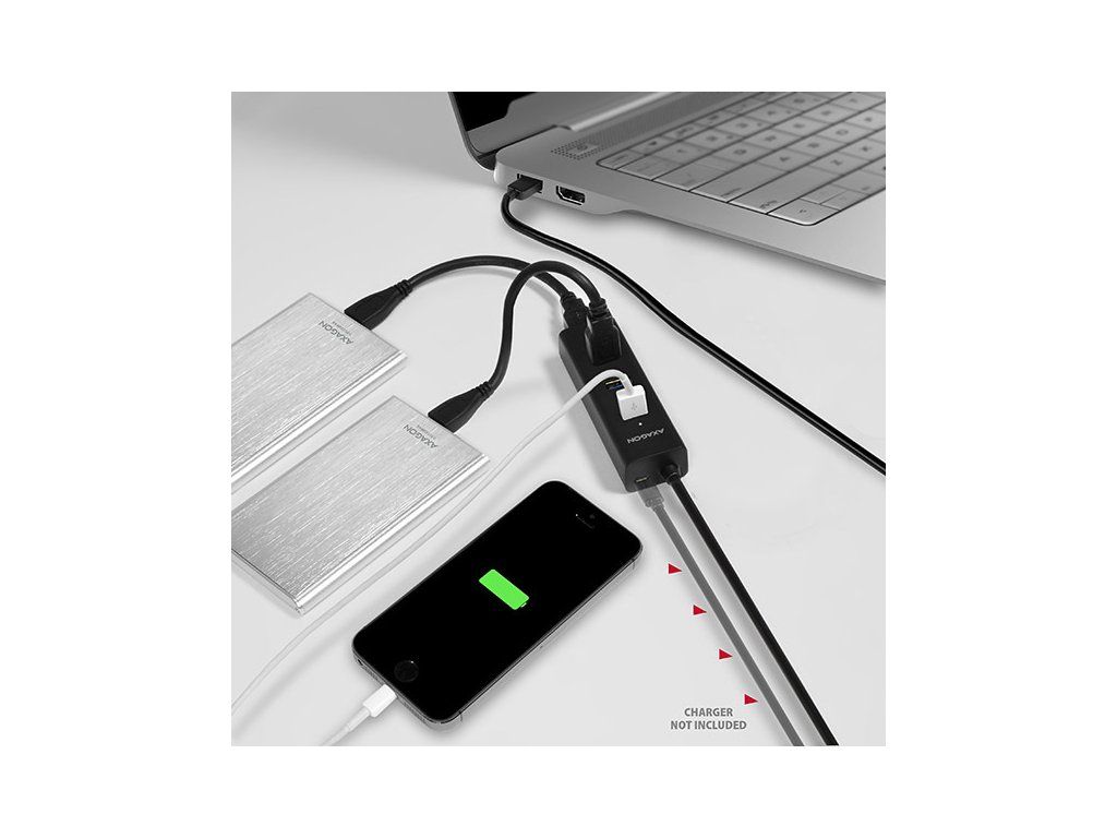 Veľkou výhodou je možnosť externého napájania rozbočovača z akejkoľvek nabíjačky mobilného zariadenia s konektorom micro USB. Vďaka nepoužívanej nabíjačke sa z tohto rozbočovača USB stane rýchlonabíjací rozbočovač zadarmo. Mobilné telefóny, tablety, powerbanky a ďalšie zariadenia možno nabíjať prúdom až 2 A (v závislosti od použitej nabíjačky) v ktoromkoľvek porte rozbočovača vďaka podpore nabíjania batérií USB 1.2. Podporuje nabíjanie tabletov iPad bez dodatočného napájania s cca. 1A (priamo z USB 3.0 porty v počítači zvyčajne nedokážu nabíjať iPad). Môže fungovať aj ako samostatný nabíjací rozbočovač a nabíjať zariadenia USB z napájacieho adaptéra, aj keď je počítač vypnutý alebo odpojený.
