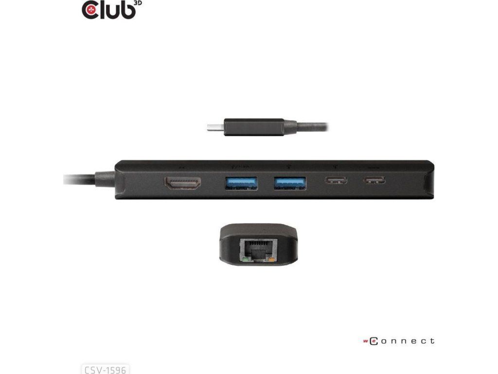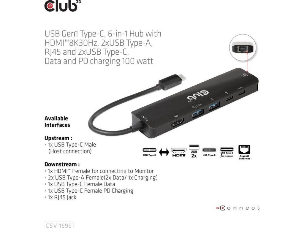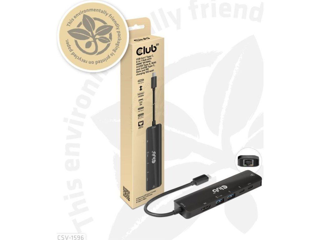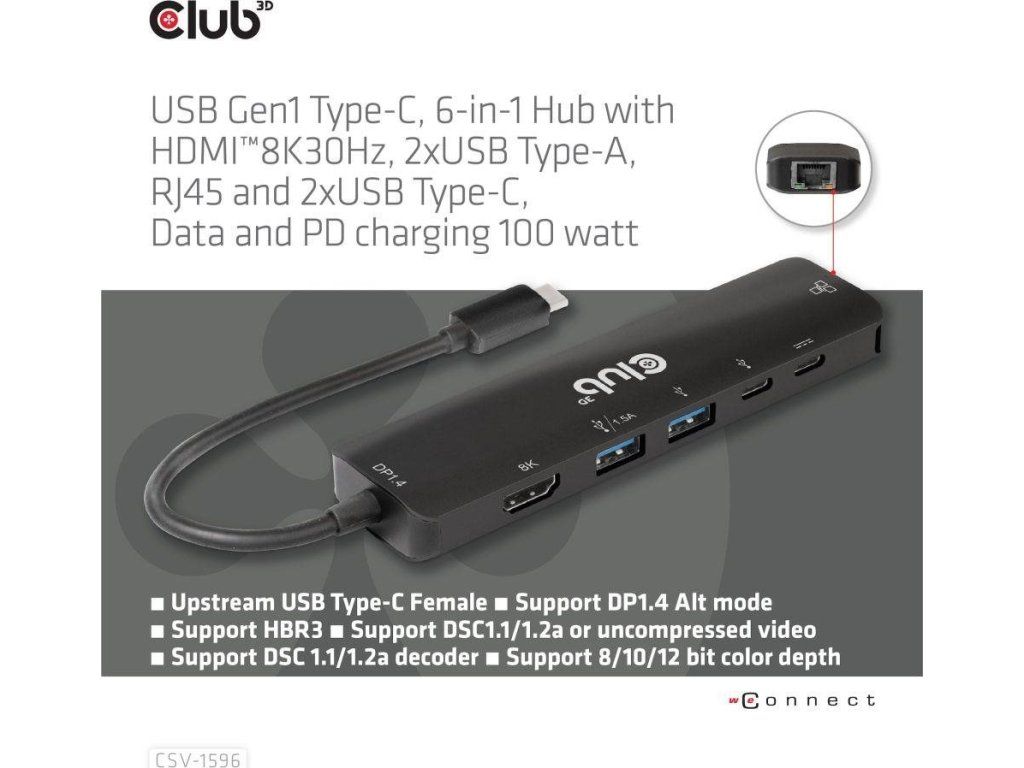 Club 3D CSV-1596 je USB Gen1 Type-C, rozbočovač 6 v 1 s HDMI™8K30Hz, 2xUSB Type-A, RJ45 a 2xUSB Type-C, dátové a PD nabíjanie 100 W, ktorý poskytuje ideálne riešenie na rozšírenie portu hostiteľa Type-C/Thunderbolt (PC/Laptop/Mobilný telefón atď.), najmä pre hostiteľov s jedným portom typu C. Tento rozbočovač využíva najnovšiu technológiu DP1.iC podporuje režim 4 Alt, ktorý umožňuje výstup videa HDMI™ s max. 8K30Hz a medzitým prenášať USB 3.1 dáta s maximálnou rýchlosťou 5 Gb/s. Dátové porty USB typu A a typu C umožňujú súčasné pripojenie 4 zariadení USB. 1 Gigabit Ethernet pre super rýchly Ethernet. Okrem toho samica typu C podporuje PD 3.0 PD Nabíjanie 100 W (15 W je vyhradených na fungovanie tohto produktu, zvyšok energie (max. 85 W) sa odovzdá na nabíjanie pre hostiteľa. Tento rozbočovač 6 v 1 bude fungovať na všetkých hostiteľských zariadeniach typu C s podporou režimu DP Alt.