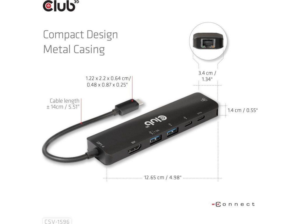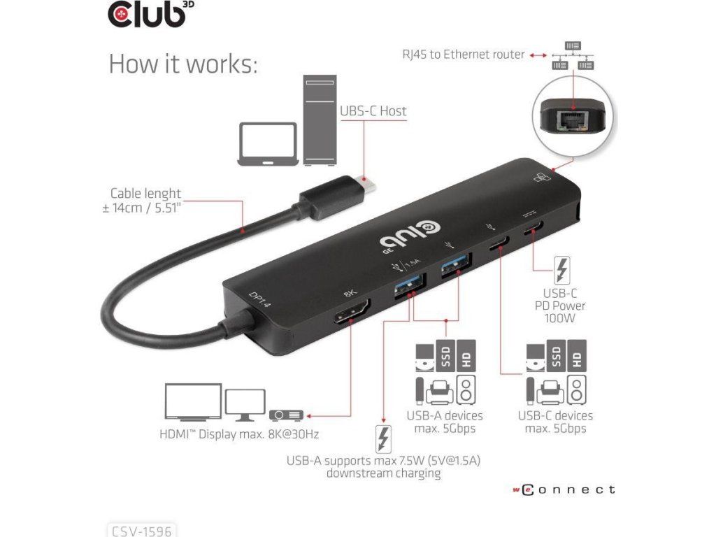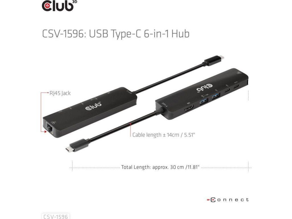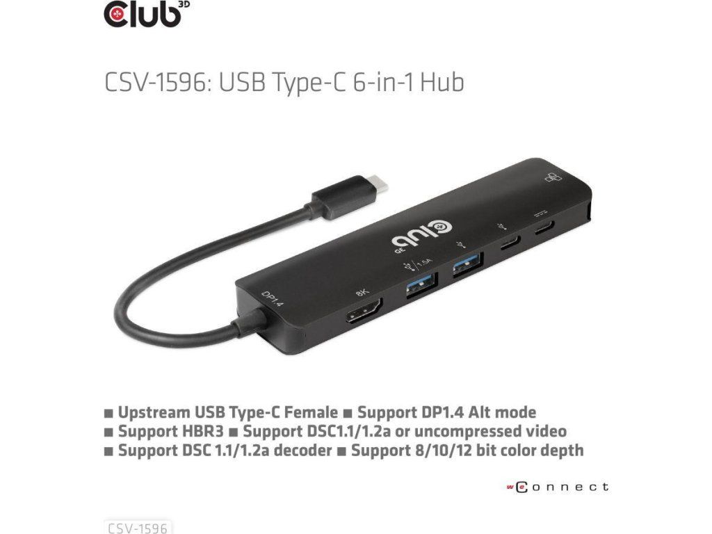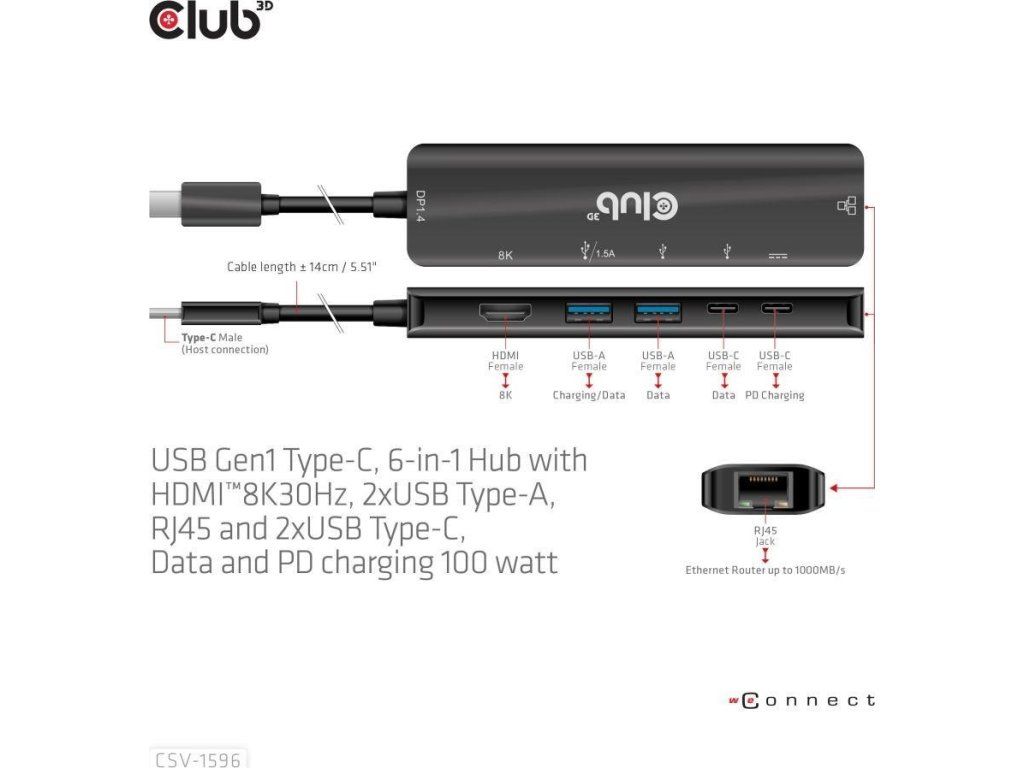 Club 3D CSV-1596 je USB Gen1 Type-C, rozbočovač 6 v 1 s HDMI™8K30Hz, 2xUSB Type-A, RJ45 a 2xUSB Type-C, dátové a PD nabíjanie 100 W, ktorý poskytuje ideálne riešenie na rozšírenie portu hostiteľa Type-C/Thunderbolt (PC/Laptop/Mobilný telefón atď.), najmä pre hostiteľov s jedným portom typu C. Tento rozbočovač využíva najnovšiu technológiu DP1.iC podporuje režim 4 Alt, ktorý umožňuje výstup videa HDMI™ s max. 8K30Hz a medzitým prenášať USB 3.1 dáta s maximálnou rýchlosťou 5 Gb/s. Dátové porty USB typu A a typu C umožňujú súčasné pripojenie 4 zariadení USB. 1 Gigabit Ethernet pre super rýchly Ethernet. Okrem toho samica typu C podporuje PD 3.0 PD Nabíjanie 100 W (15 W je vyhradených na fungovanie tohto produktu, zvyšok energie (max. 85 W) sa odovzdá na nabíjanie pre hostiteľa. Tento rozbočovač 6 v 1 bude fungovať na všetkých hostiteľských zariadeniach typu C s podporou režimu DP Alt.