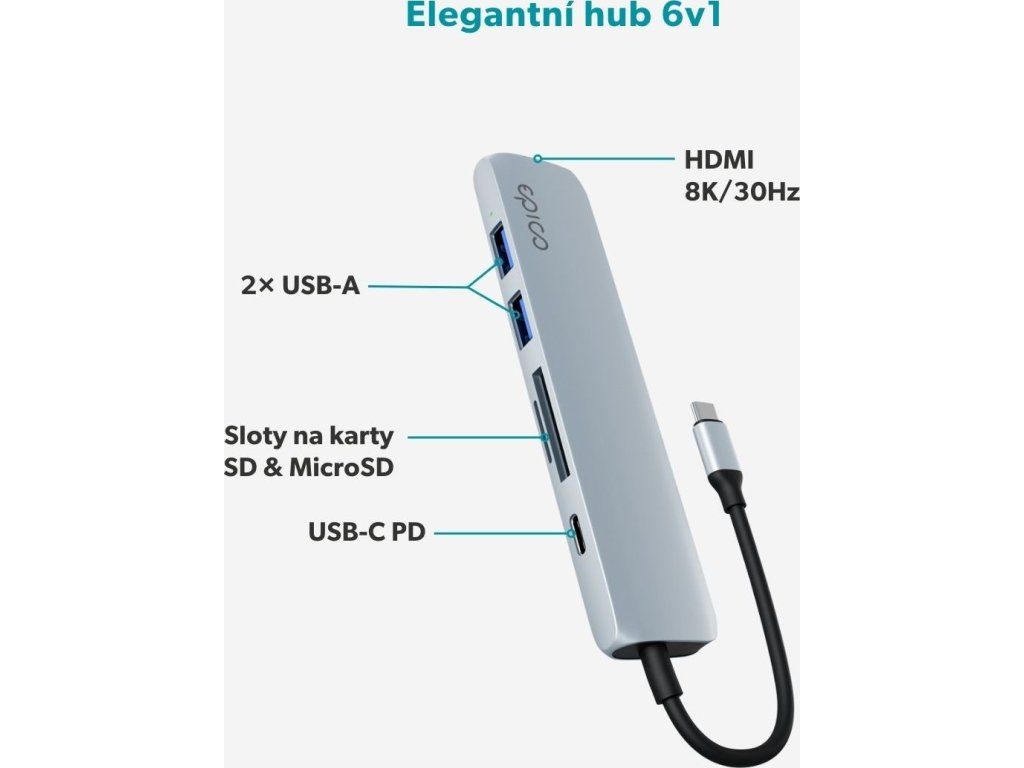 Epico 6in1 Aluminium Hub přináší elegantní řešení pro každodenní práci i multimediální využití. Díky šesti základním portům – HDMI, USB-C Power Delivery, dvěma USB-A a slotům na SD i MicroSD karty – získáte spolehlivé připojení pro všechna svá zařízení. HDMI port podporuje rozlišení až 8K/30Hz nebo 4K/120Hz, takže využijete plný potenciál monitorů s vysokým rozlišením. Hub navíc prostřednictvím HDMI portu zajišťuje precizní podání dynamického obrazu a zvuku díky technologii Dynamic HDR+ s až 12bitovou barevnou hloubkou a multikanálovým zvukem, včetně Dolby Atmos a DTS:X.