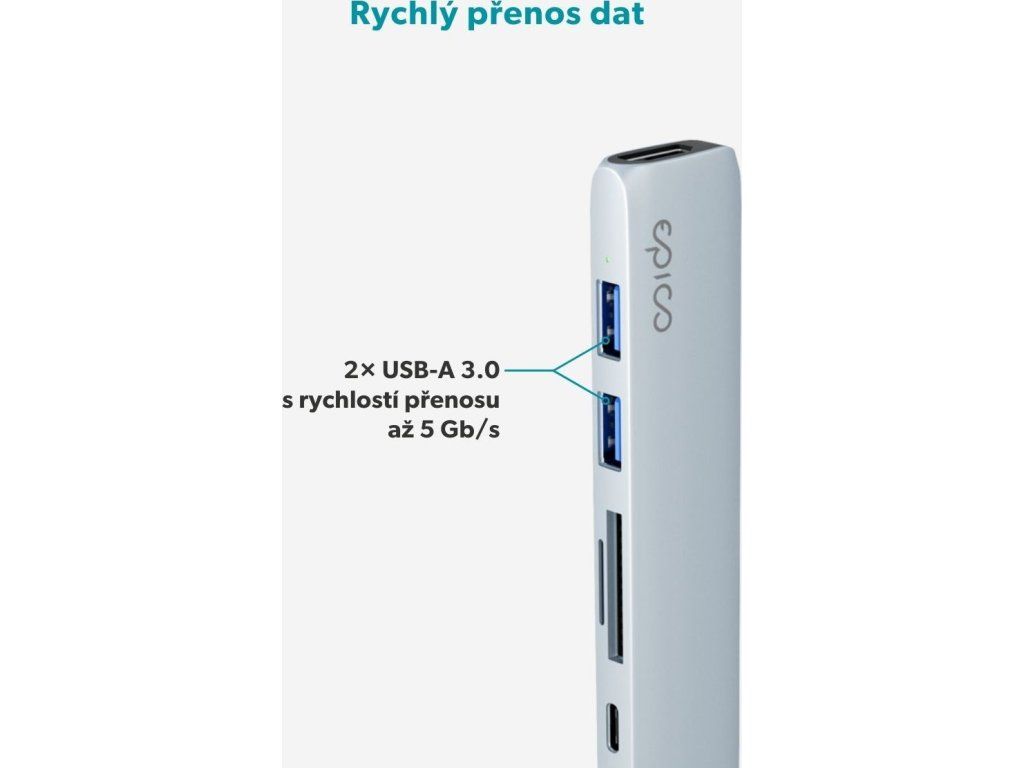 Průchozí nabíjení s výkonem až 100 W zaručuje, že váš notebook zůstane napájený i při maximálním zatížení. USB-A porty umožňují přenos dat rychlostí až 5 Gb/s, zatímco sloty na SD a MicroSD karty dosahují rychlosti až 104 Mb/s – ideální pro rychlé přesouvání a kopírování souborů. Hliníkové tělo zajišťuje prémiový vzhled, odolnost a efektivní odvod tepla, takže se na hub můžete spolehnout i při dlouhodobém používání.