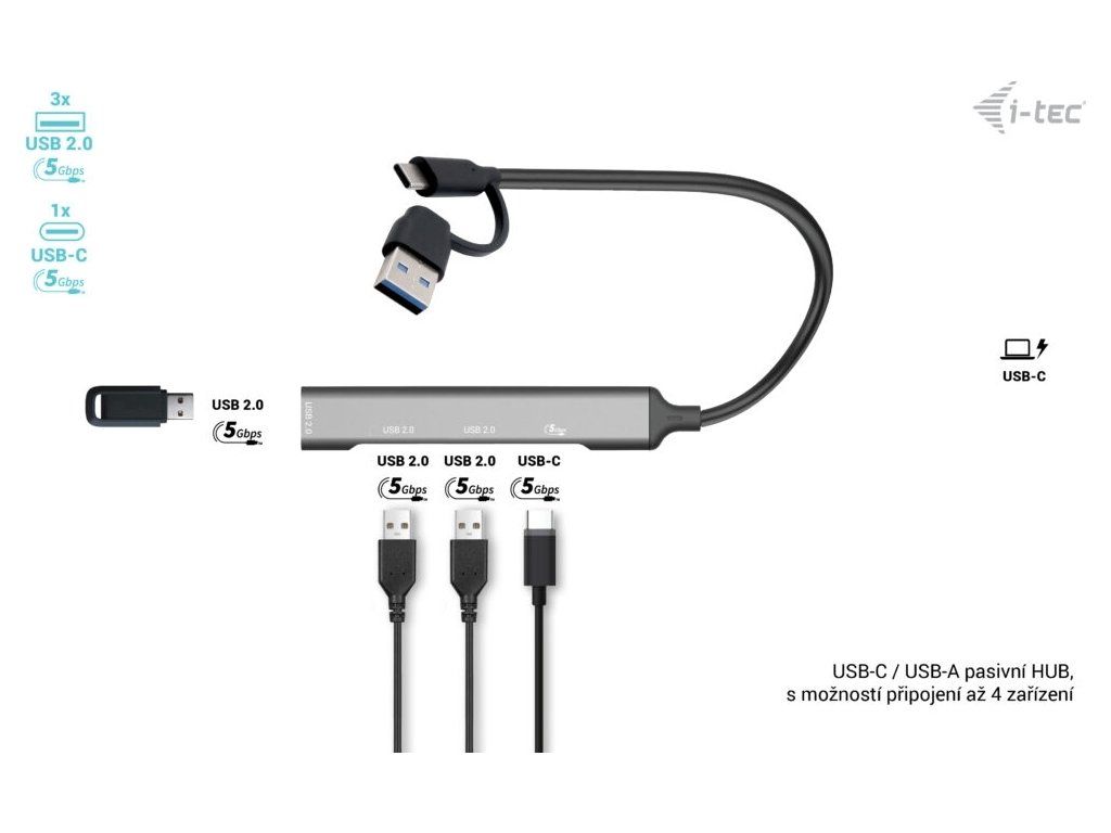 • Univerzální pasivní HUB USB-C/USB-A umožňuje připojit až 4 zařízení.