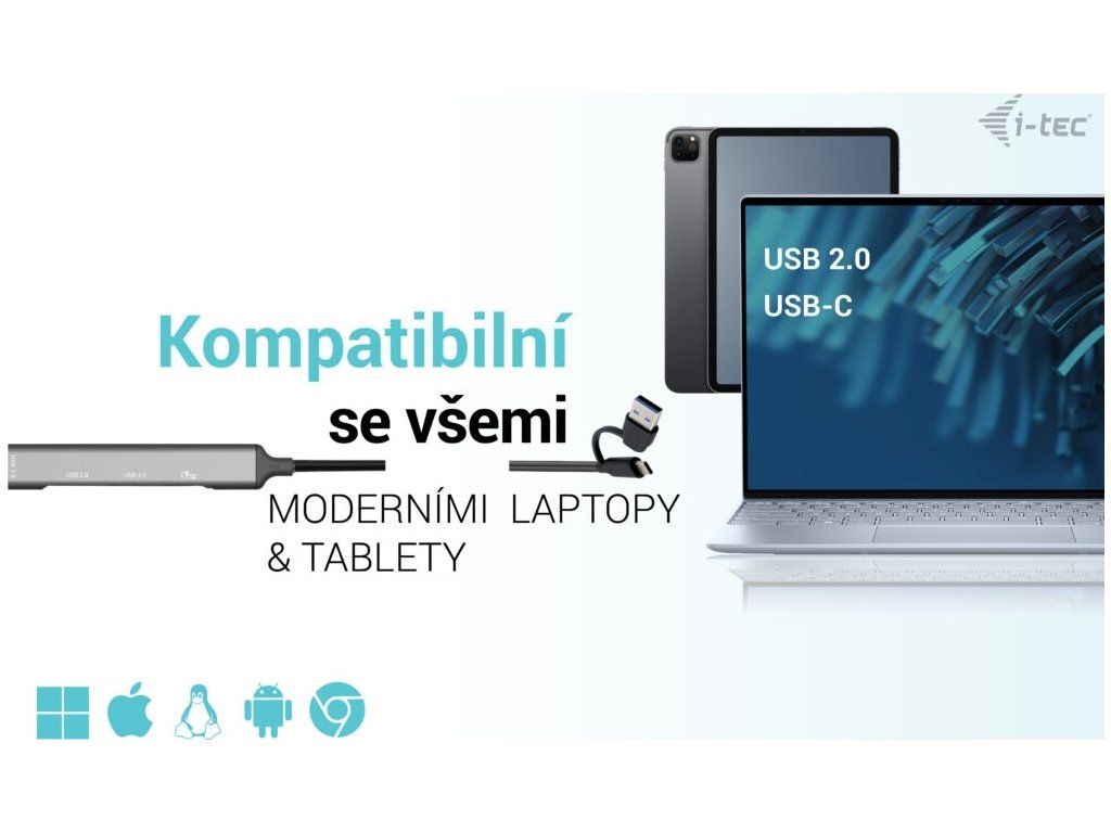 • HUB podporuje všechny běžné současné operační systémy (Windows, macOS, Linux, Android, Chrome OS, iPadOS).