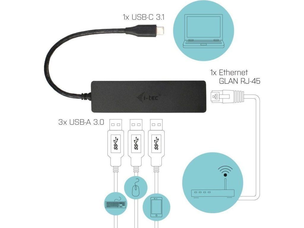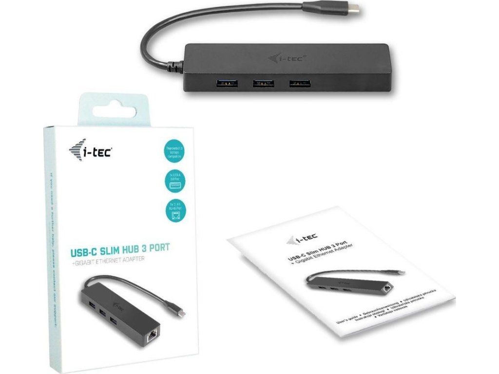 i-tec USB C Slim 3-portový HUB s adaptérom Gigabit Ethernet, USB 3.0 na RJ-45, 10/100/1000 Mb/s, 3x USB 3.0 port, pre notebook tablet smartfón PC s konektorom USB-C, kompatibilný s Thunderbolt 3, Windows Mac Linux Android